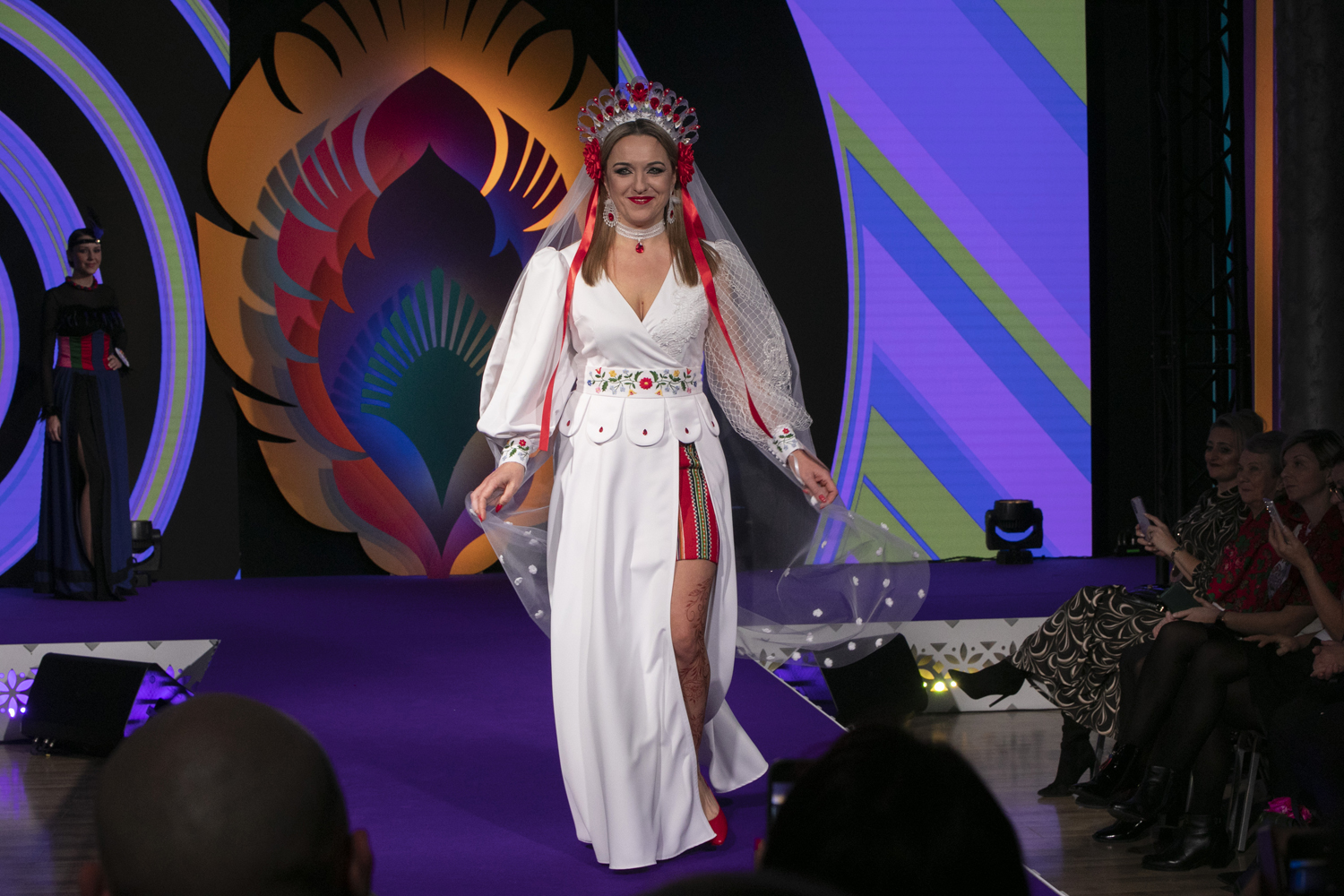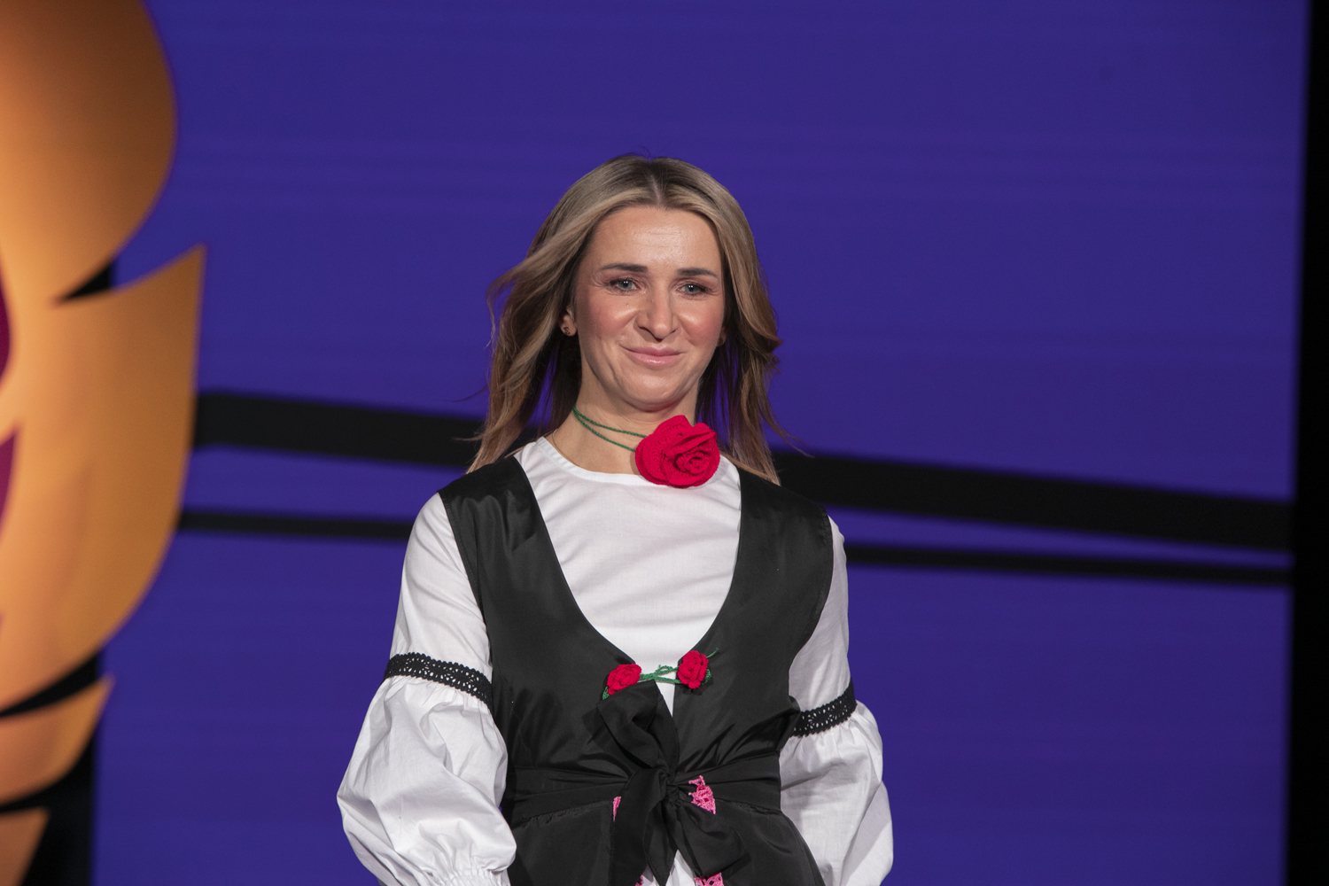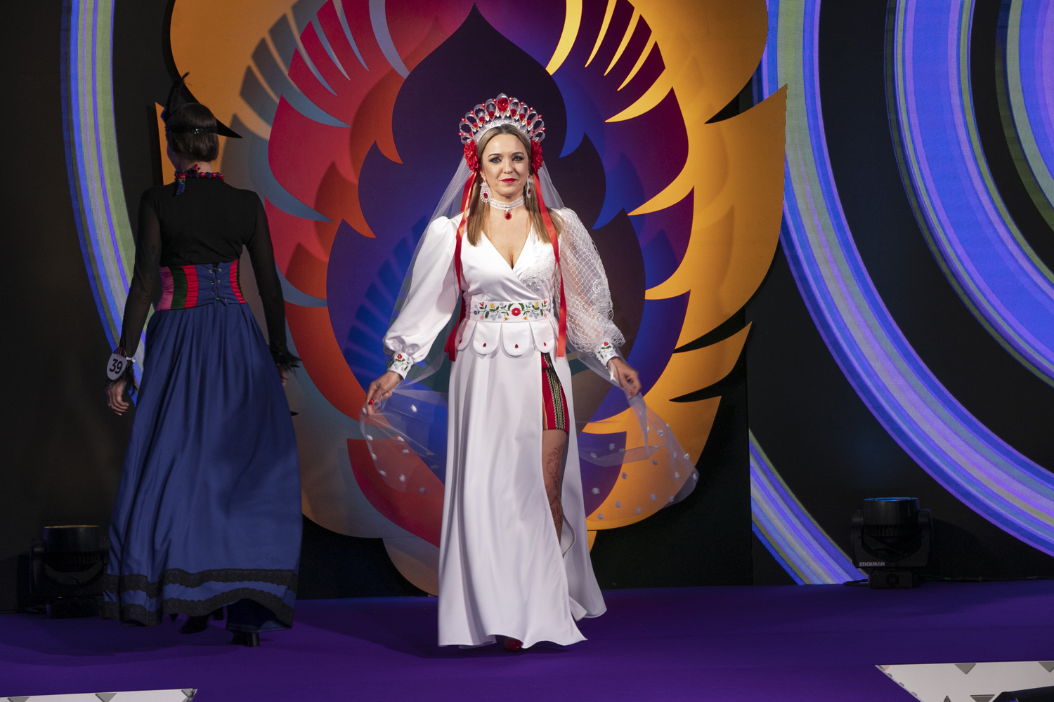 – Nasza propozycja to suknia ślubna inspirowana ludowymi strojami z powiatu piotrkowskiego, która została wykonana samodzielnie przez członkinie KGW Wolbórz. Nasza kopertowa suknia jest ozdobiona bufiastymi rękawami, z których jeden wykonany jest techniką koronki klockowej przez twórczynię ludową, panią Elżbietę Bąk. Głębokie rozcięcie kryje spódnicę z tradycyjnej zapaski, w których występują nasze dziewczyny z KGW – mówi Magdalena Wnukiewicz, reprezentująca KGW z Wolborza. Stój dopełniał efektowny czepiec z czerwonymi, wstążkowymi kwiatami, a także kamieniami, kryształkami i piórami oraz z tradycyjnym, tiulowym welonem ozdobiony kwiatuszkami wykonanymi metodą szydełkową.