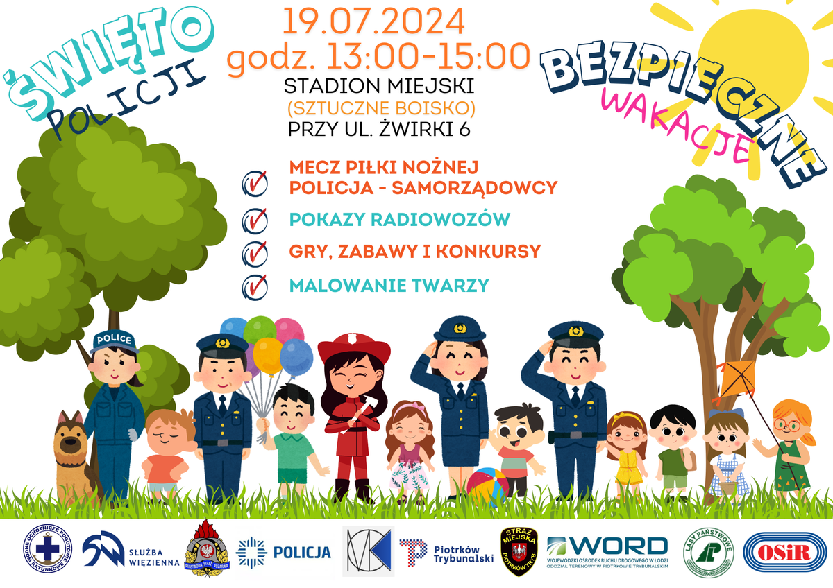 Policjanci zapraszają na piknik rodzinny pn. „Bezpieczne Wakacje” z okazji Święta Policji 2024. Impreza odbywa się pod patronatem starosty powiatu Piotra Łącznego oraz prezydenta Juliusza Wiernickiego.