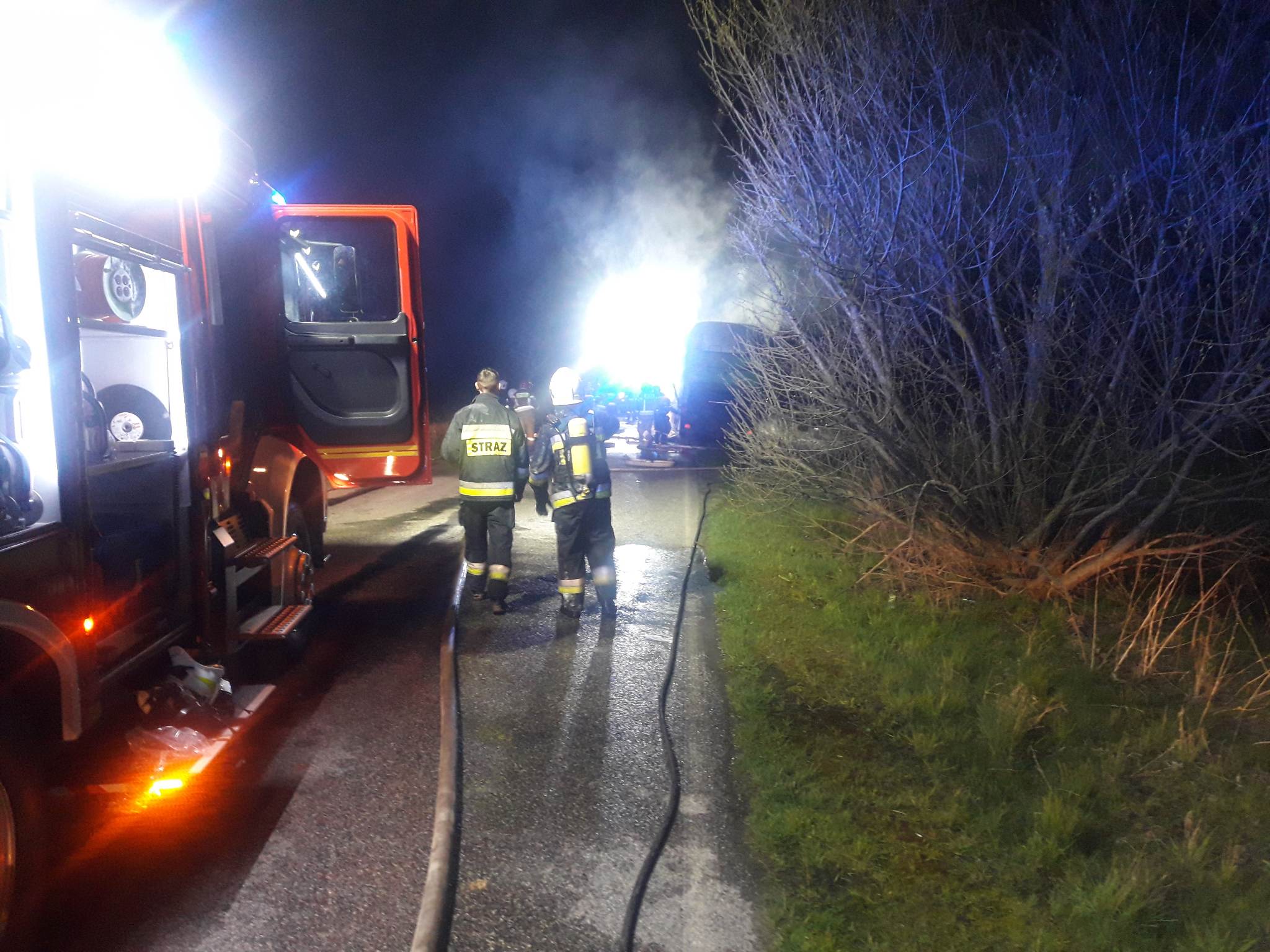 Do pożaru doszło tuż przed godziną 21:00, w miejscowości Dąbrowa w gminie Wolbórz. Z ogniem walczyło pięć zastępów strażaków. Pojazdu niestety nie udało się uratować.