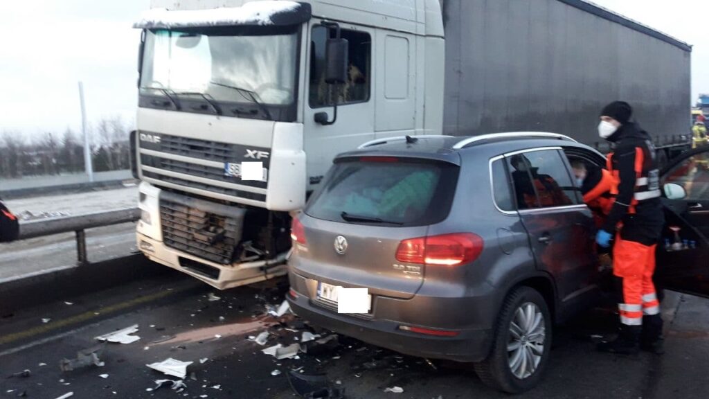 Do zdarzenia doszło wczesnym porankiem, na DK1 na wysokości miejscowości Gąski. – Ze wstępnych ustaleń piotrkowskich policjantów wynika, że na remontowanym odcinku drogi, kierujący vw tiguanem jadąc w kierunku Częstochowy, z nieznanych przyczyn przejechał na przeciwległy pas ruchu i zderzył się z pojazdem ciężarowym marki daf jadącym w kierunku Piotrkowa. Następnie w ciężarówkę wjechały dwie osobówki – citroen i renault. Kierujący volkswagenem, oraz 9 i 12-letni pasażerowie samochodu przewiezieni zostali do szpitala w Bełchatowie, natomiast kierujący citroenem i renaultem do szpitala w Piotrkowie – informuje asp. Izabela Gajewska z KMP w Piotrkowie Trybunalskim.