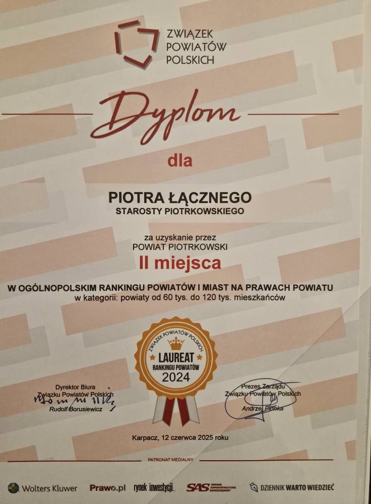 Podczas 32. Zgromadzenia Ogólnego Związku Powiatów Polskich, które odbyło się w Karpaczu, powiat piotrkowski ponownie stanął na podium w Ogólnopolskim Rankingu Powiatów. Drugie miejsce w kategorii powiatów do 120 tysięcy mieszkańców za 2024 rok odebrał starosta Piotr Łączny, potwierdzając po raz kolejny, że lokalny samorząd należy do ścisłej czołówki w kraju.