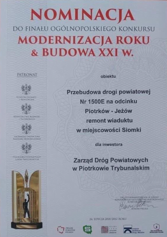 Inwestycja Powiatu Piotrkowskiego – remont wiaduktu w Siomkach wraz przebudową drogi powiatowej Piotrków – Jeżów – zakwalifikowana do finału Ogólnopolskiego Konkursu Modernizacja Roku & Budowa XXI w. Organizatorem 26. edycji konkursu jest Stowarzyszenie Ochrony Narodowego Dziedzictwa Materialnego, a o miano najlepszych rywalizują inwestorzy, wykonawcy i projektanci. Laureatów wybierze specjalnie powołane jury.
