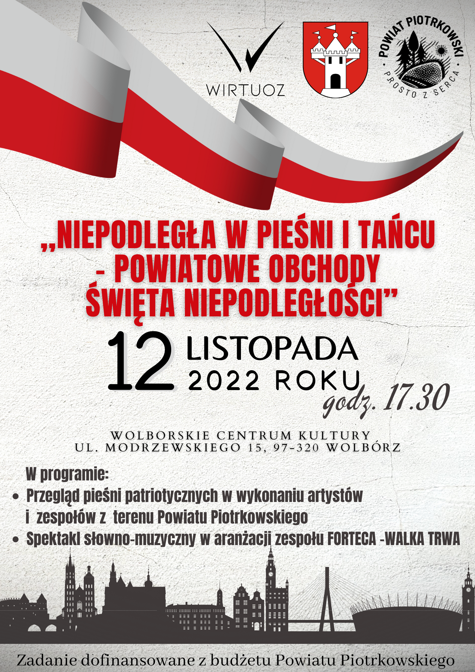 Starosta Powiatu Piotrkowskiego i Burmistrz Wolborza zapraszają na uroczystość „Niepodległa w pieśni i tańcu – Powiatowe obchody Święta Niepodległości”. Obchody odbędą się 12 listopada o godz. 17.30 w Wolborskim Centrum Kultury. Zadanie dofinansowane jest z budżetu Powiatu Piotrkowskiego, organizatorem wydarzenia jest wolborskie Stowarzyszenie „Wirtuoz”.