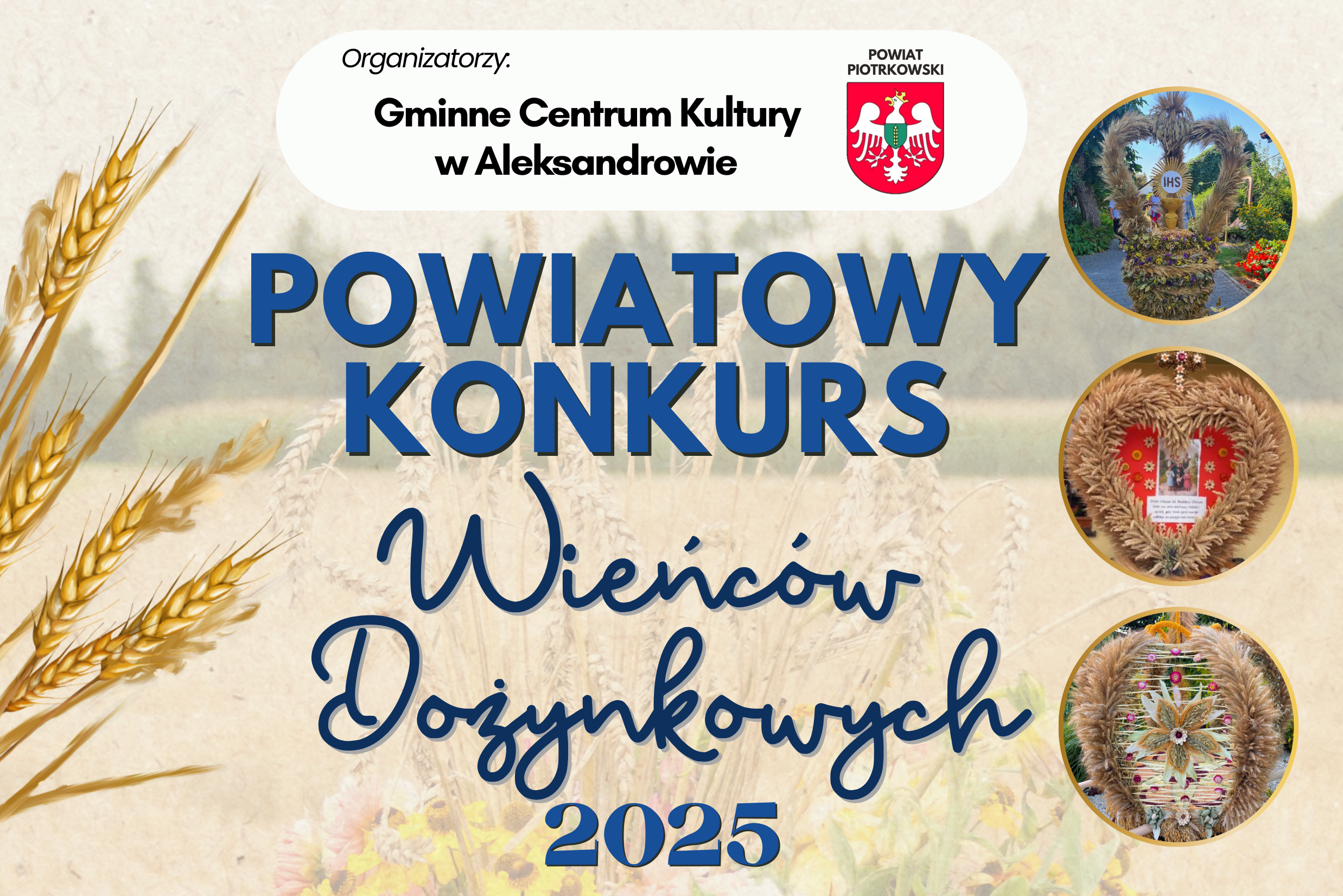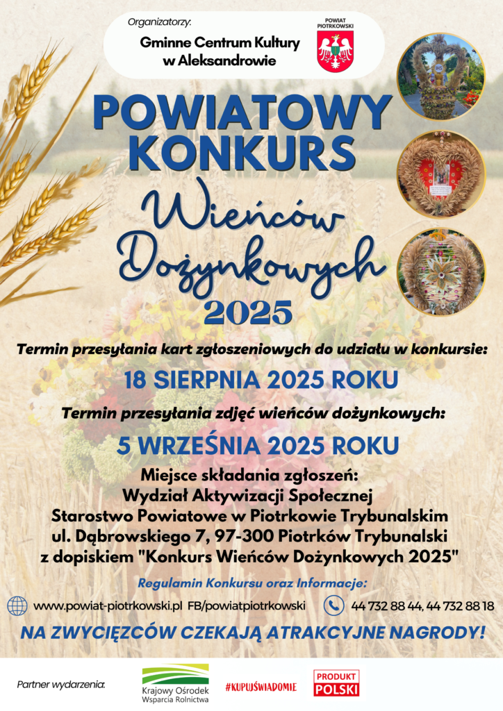 Dożynki bez wieńca? To jak święta bez choinki! Dlatego już dziś zapraszamy wszystkich miłośników tradycji i twórców ludowych do udziału w Powiatowym Konkursie Wieńców Dożynkowych 2025, organizowanym przez Starostwo Powiatowe w Piotrkowie Trybunalskim oraz Gminne Centrum Kultury w Aleksandrowie.