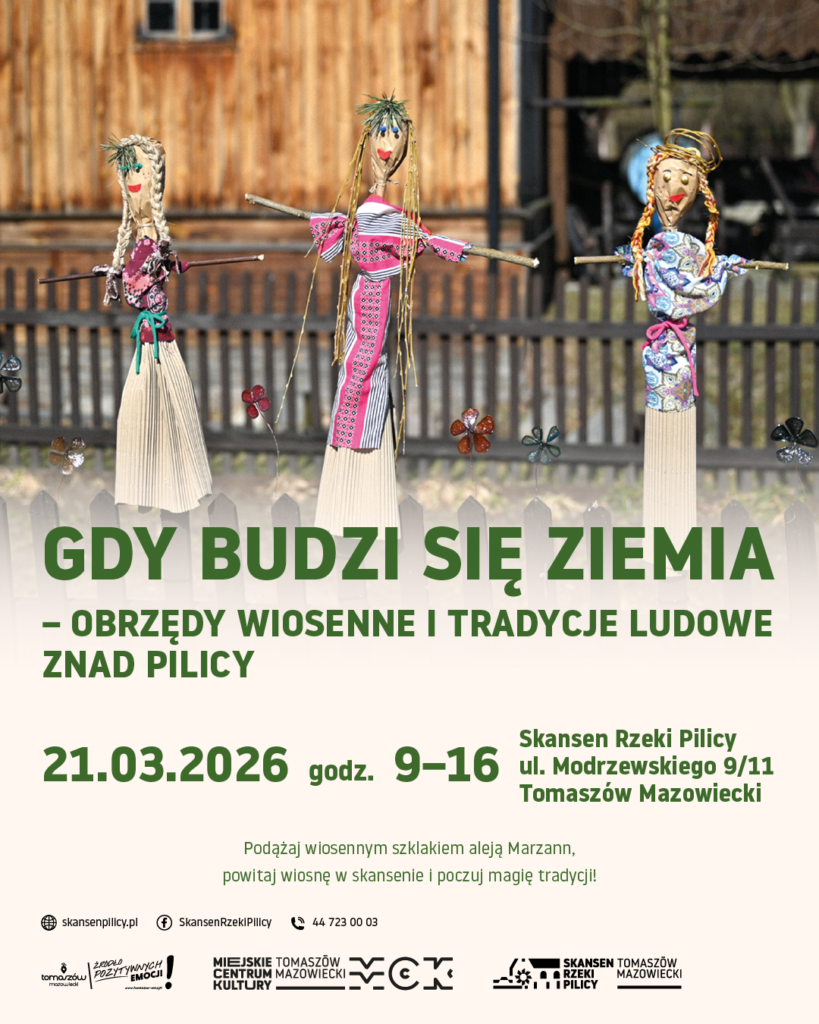 21 marca 2026 r. w godzinach 9:00–16:00 w Skansenie Rzeki Pilicy w Tomaszowie Mazowieckim odbędzie się wydarzenie pt. „Gdy budzi się ziemia – obrzędy wiosenne i tradycje ludowe znad Pilicy”, czyli powitanie wiosny w Skansenie Rzeki Pilicy. Wydarzenie będzie okazją do zapoznania się z wybranymi ludowymi zwyczajami wiosennymi regionu nadpilickiego oraz prezentacją tradycji związanych z symboliką Marzanny.