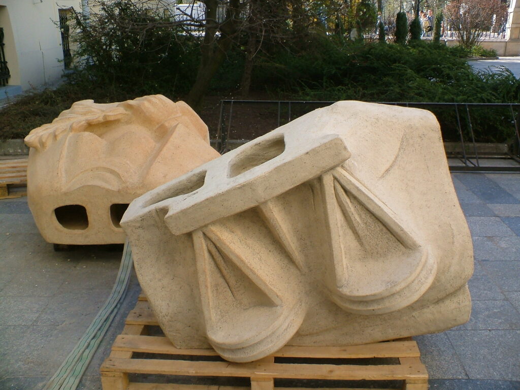 Tak, jak Teatr Wielki w Warszawie odzyskał w pierwszej dekadzie lat dwutysięcznych swoją kwadrygę Apollina, tak i Pałac Sprawiedliwości w Piotrkowie postarał się o udany powrót swojej szczytowej rzeźby. Oczywiście wróciła replika nawiązująca konturami do oryginału, jednak wykonana w zupełnie innym stylu. Słaba jakość zdjęć z początku XX wieku nie pozwoliła na dokładne odwzorowanie wyglądu posągu Temidy w skali 1:1. Twórcą zrekonstruowanej rzeźby, podobnie jak i ozdobnych waz, był artysta rzeźbiarz Gustaw Hadyna. Ważący 3 tony posąg, wysoki na 3,5 m. i szeroki na 6 m., przedstawia siedzącą na tronie boginię sprawiedliwości, po bokach której zasiedli rycerz i kobieta z wagą. Hadyna wykonał go z ceramiki wypalanej w temperaturze 1400 stopni Celsjusza. Do Piotrkowa rzeźba trafiła podzielona na elementy.