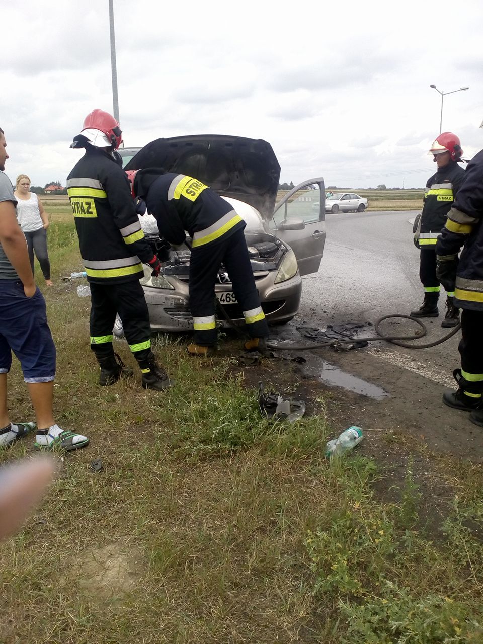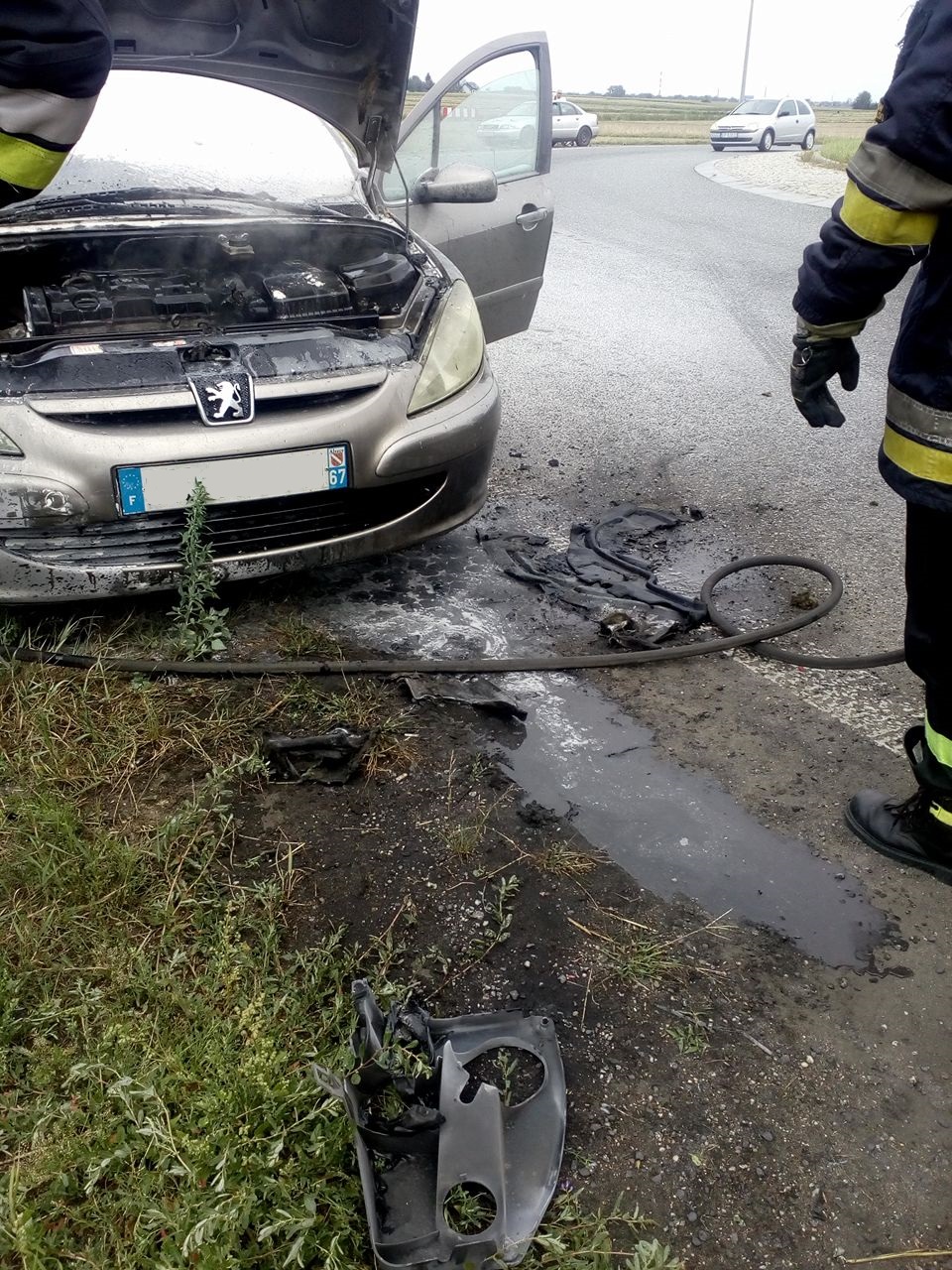wyczuwalna była woń benzyny. Chwilę po tym, w kabinie pojazdu pojawił się dym. Kierująca peugeotem natychmiast zatrzymała samochód, a pasażerowie przystąpili do gaszenia pożaru.