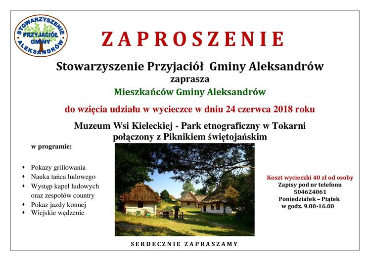 Stowarzyszenie Przyjaciół Gminy Aleksandrów organizuje wycieczkę do Muzeum Wsi Kieleckiej oraz parku etnograficznego w Tokarni. Organizatorzy w programie przewidzieli m.in. pokazy grillowania, naukę tańca ludowego, występy kapel ludowych, pokazy jazdy konnej oraz prezentację wiejskiego wędzenia. Koszt wycieczki to 40 zł od osoby. Zapisy przyjmowane są od poniedziałku do piątku w godzinach 9.00 – 16.00, pod numerem telefonu: 504 624 061.