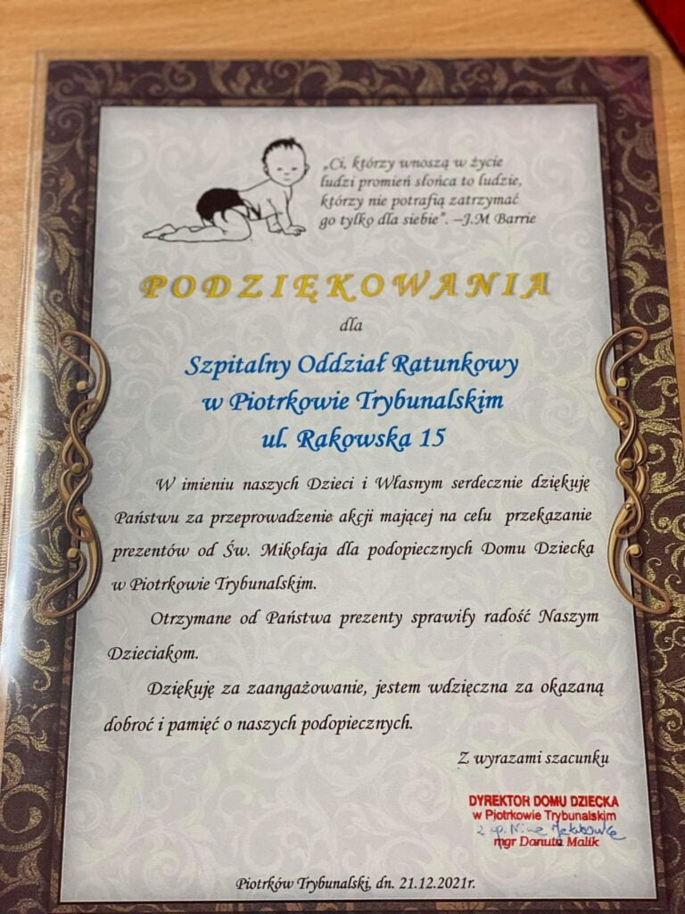 – Każdy z pracowników wybrał jedno dziecko dla którego przygotował paczkę. Przygotowaliśmy około 40 podarków. Wprawdzie wiemy, że paczki nie zastąpią kochającej rodziny, to mamy nadzieję, że podobały się podopiecznym domu dziecka i chociaż przez chwilę na ich buziach pojawiły się uśmiechy – mówi jeden z pracowników SOR. – Ponadto zorganizowaliśmy zbiórkę karmy dla czworonogów z piotrkowskiego schroniska. Teraz na pewno nie będą głodne. – dodaje nasz rozmówca.