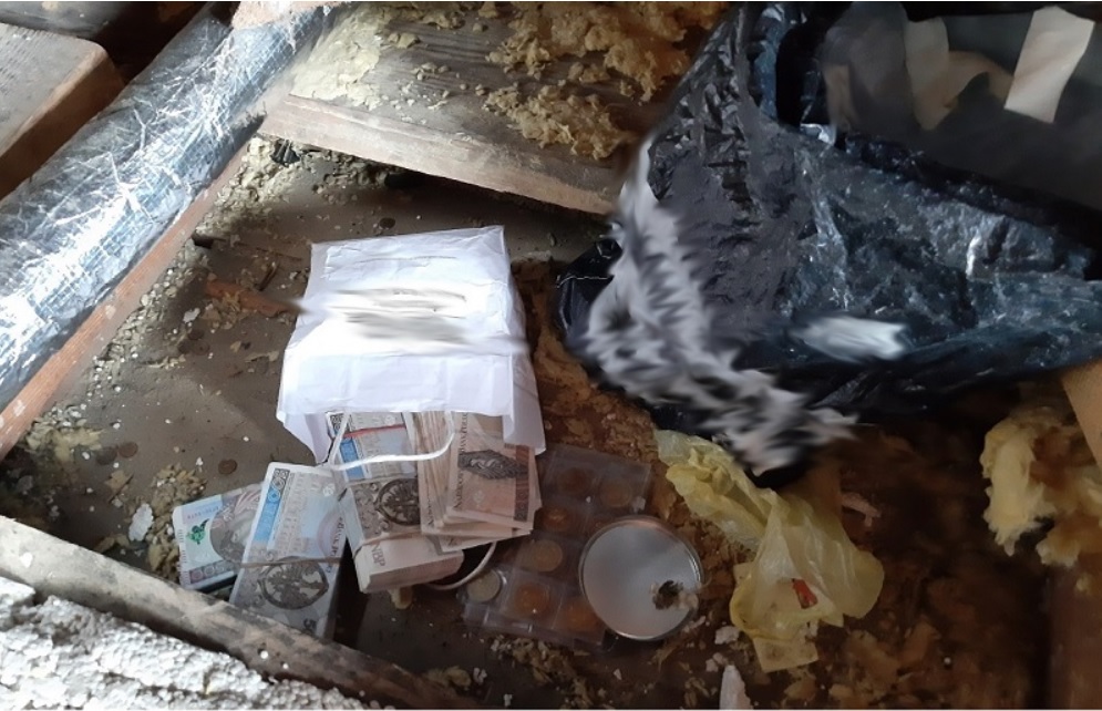 KAS i CBŚP przeszukały również inną nieruchomość na terenie tego samego powiatu, mogącą mieć związek ze sprawą. Na terenie posesji znaleziono pistolet z magazynkiem, a w nim 4 sztuki naboi, a także tłumik i dodatkowe 50 sztuk amunicji. Na strychu, w specjalnym schowku znajdującym się pod podłogą, funkcjonariusze odkryli kilkaset tysięcy złotych w gotówce, a łącznie na terenie całej posesji zabezpieczyli ponad 620 tysięcy złotych. Kobieta, u której znaleziono broń oraz amunicję została zatrzymana.