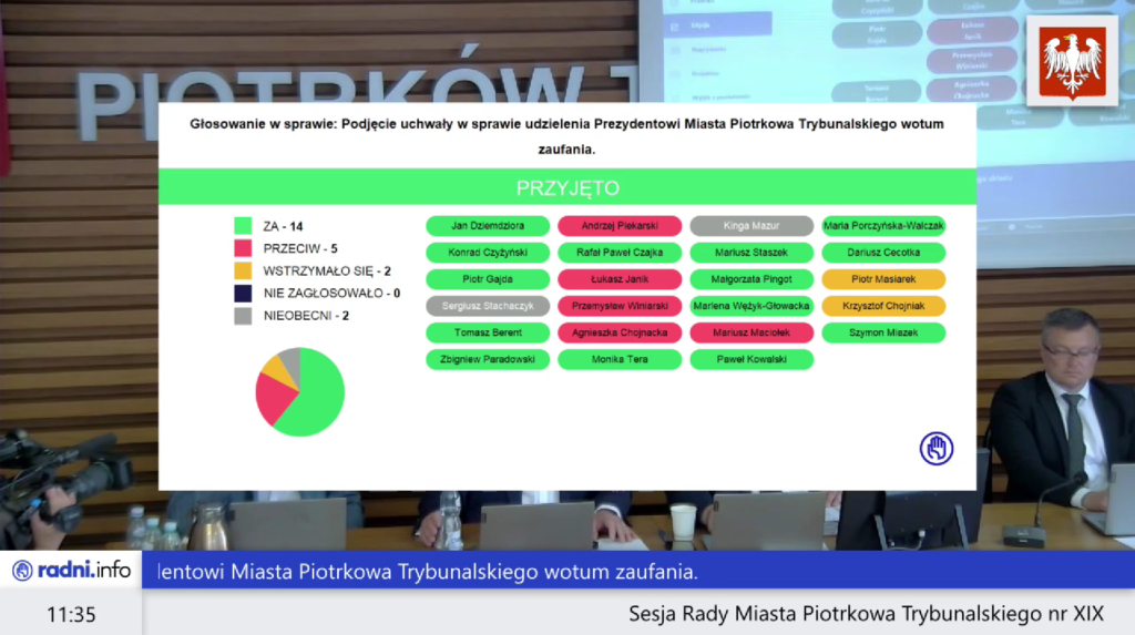 Podczas środowej (25.06) sesji Rady Miasta, Prezydent Piotrkowa Trybunalskiego, Juliusz Wiernicki, otrzymał wotum zaufania od miejskich radnych. Wynik głosowania wyraźnie wskazał na poparcie dla działań prezydenta – 14 radnych opowiedziało się ZA udzieleniem wotum zaufania, 5 było PRZECIW, a 2 wstrzymało się od głosu. Dwóch radnych było nieobecnych.