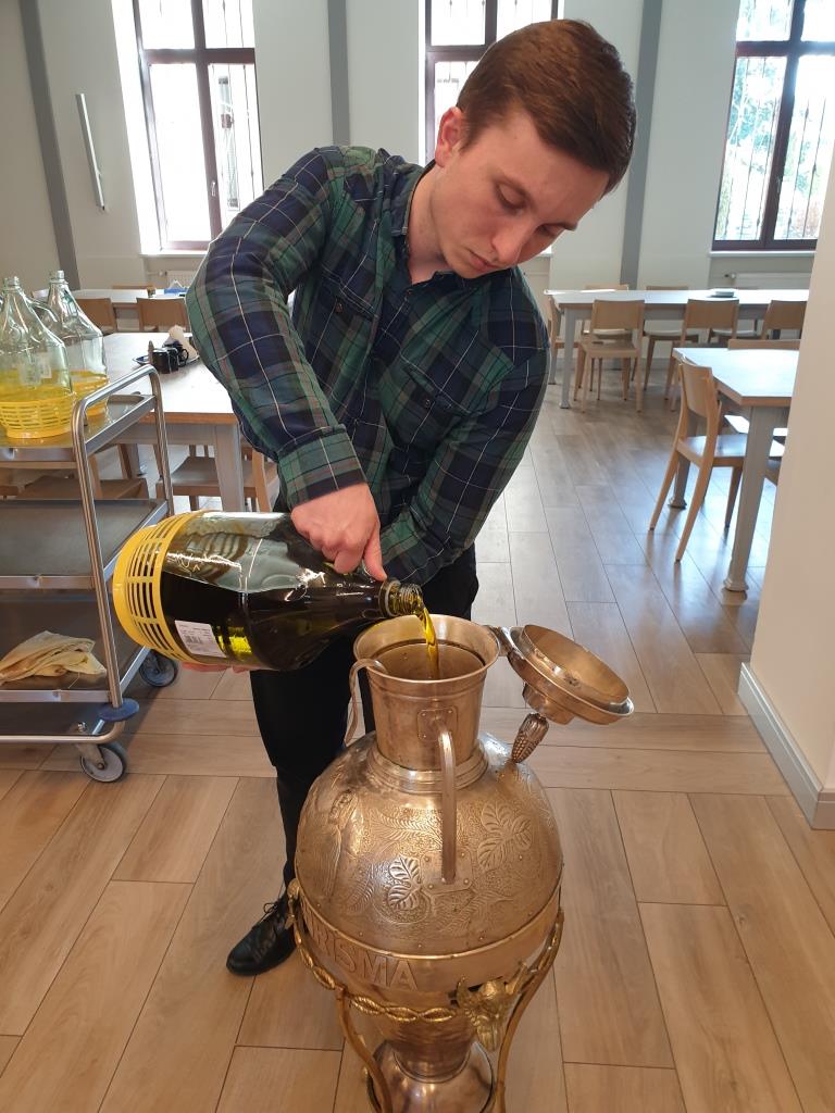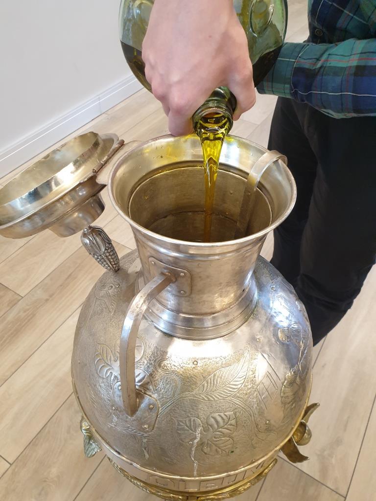 Do przygotowania Olejów Świętych wykorzystujemy 24 litry włoskiej oliwy z Oliwek, którą wlewamy do dwu stągwi wykorzystywanych w liturgii. – tłumaczy ks. Hubert Kempiński – ceremoniarz biskupi.