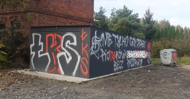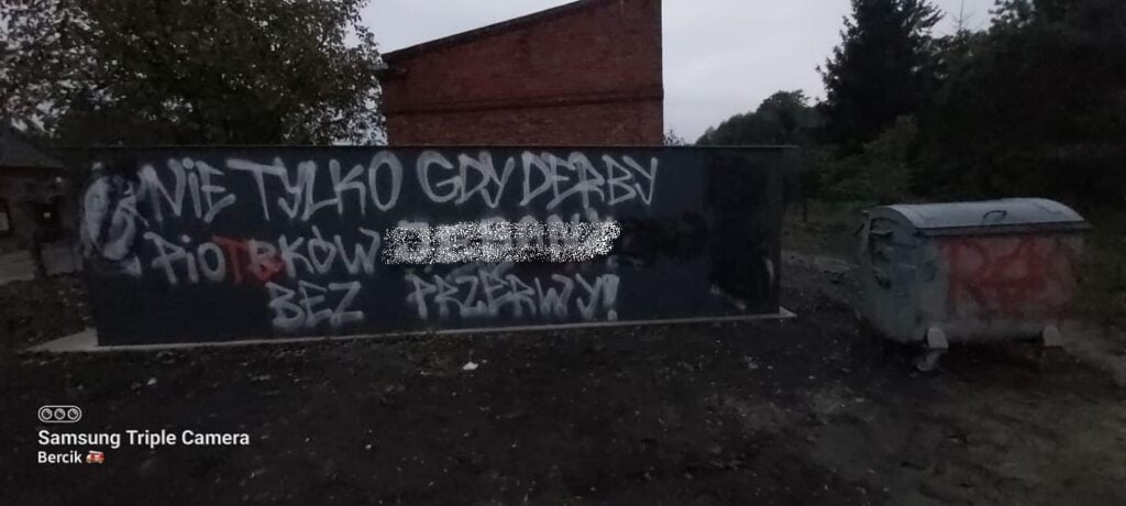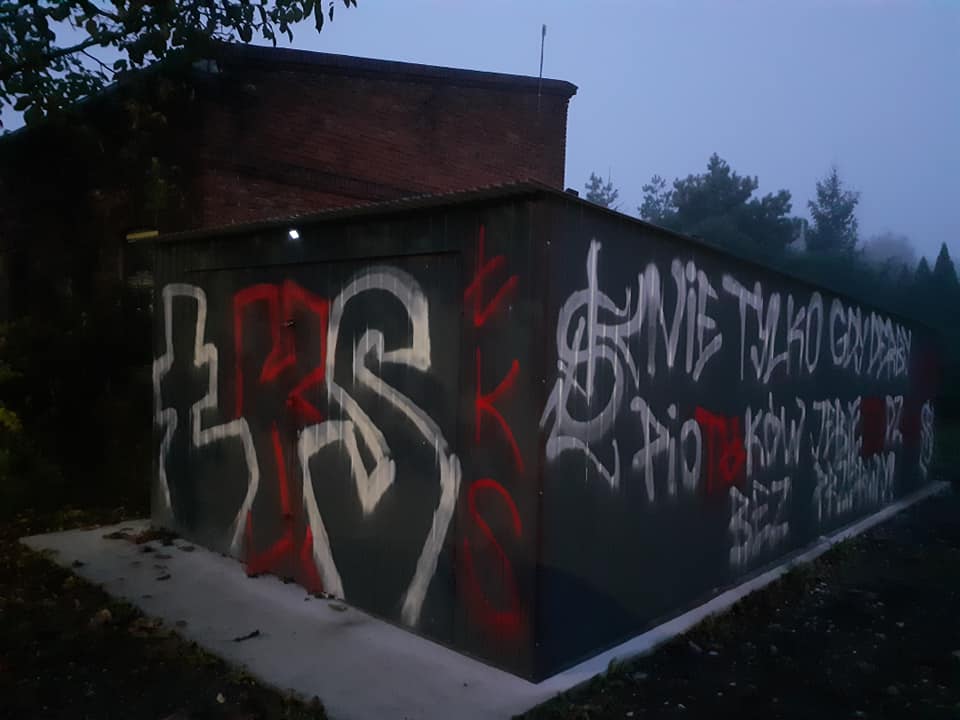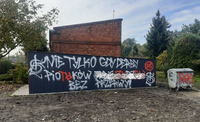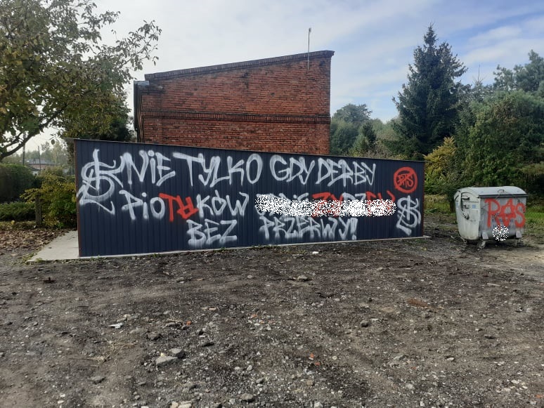 Prawdopodobnie pseudokibice Łódzkiego Klubu Sportowego i Widzewa Łódź zniszczyli garaż na sprzęt strażacki drużyny OSP Moszczenica. Pierwsze obraźliwe napisy pseudograficiarzy pojawiły się w nocy z środy na czwartek. Minionej nocy pojawiły się kolejne wulgaryzmy.