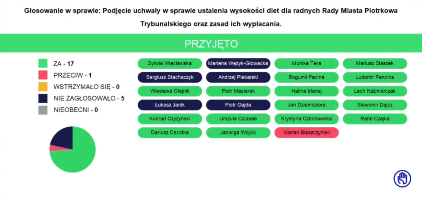 ZA podniesieniem diet dla siebie, głosowało 17 radnych, 1 osoba była przeciwna, a 4 radnych nie oddało głosu.