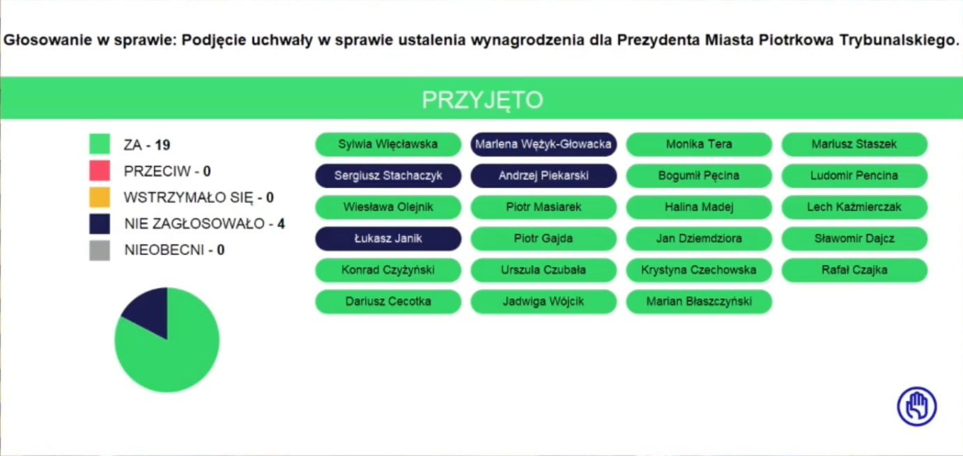 Z kolei za podniesieniem wynagrodzeni a dla prezydenta, głosowało 19 radnych, a 4 osoby nie oddały głosu. Prezydent otrzymywać będzie pensję w wysokości 19 485 zł. Co ważne, uchwała zgodnie z projektem weszła w życie z dniem podjęcia (24.11) ale „z mocą obowiązująca już od 1 sierpnia 2021”. W związku z tym, prezydentowi przysługuje wyrównanie za ostatnie 4 miesiące, czyli ponad 34 tys. złotych.