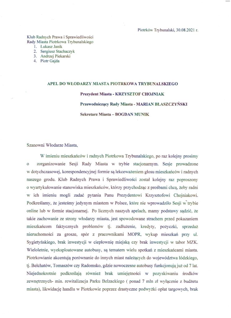 Radny Łukasz Janik a także Sergiusz Stachaczyk, Andrzej Piekarski oraz Piotr Gajda, przesłali pismo do władz miasta w sprawie powrotu do sesji RM w trybie stacjonarnym. – W imieniu mieszkańców i radnych Piotrkowa Trybunalskiego, po raz kolejny prosimy o zorganizowanie Sesji Rady Miasta w trybie stacjonarnym. Sesje prowadzone w dotychczasowej, korespondencyjnej formie są lekceważeniem głosu mieszkańców i radnych naszego grodu. Klub Radnych Prawa i Sprawiedliwości został kolejny raz poproszony o wyartykułowanie stanowiska mieszkańców – piszą sygnatariusze apelu.