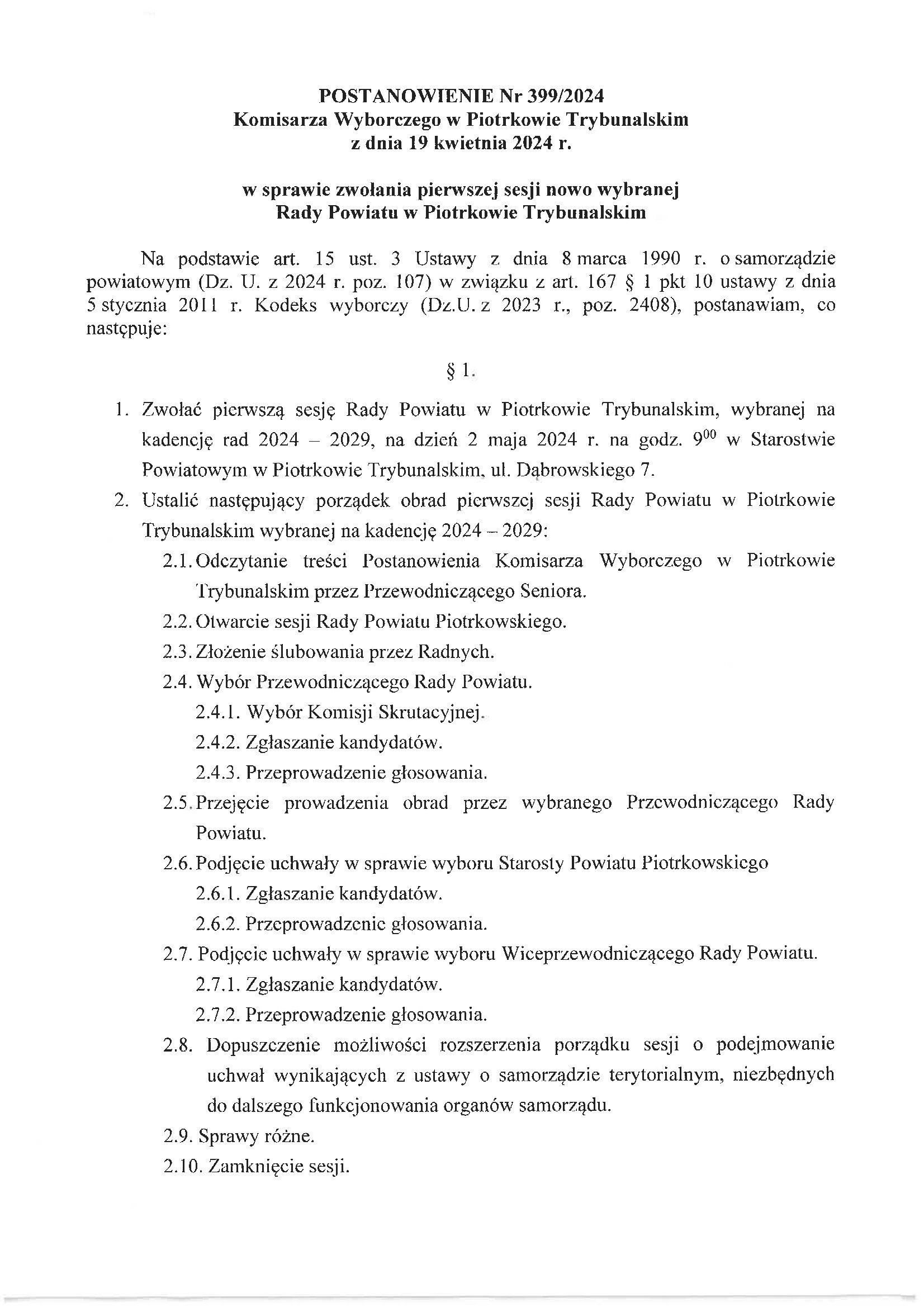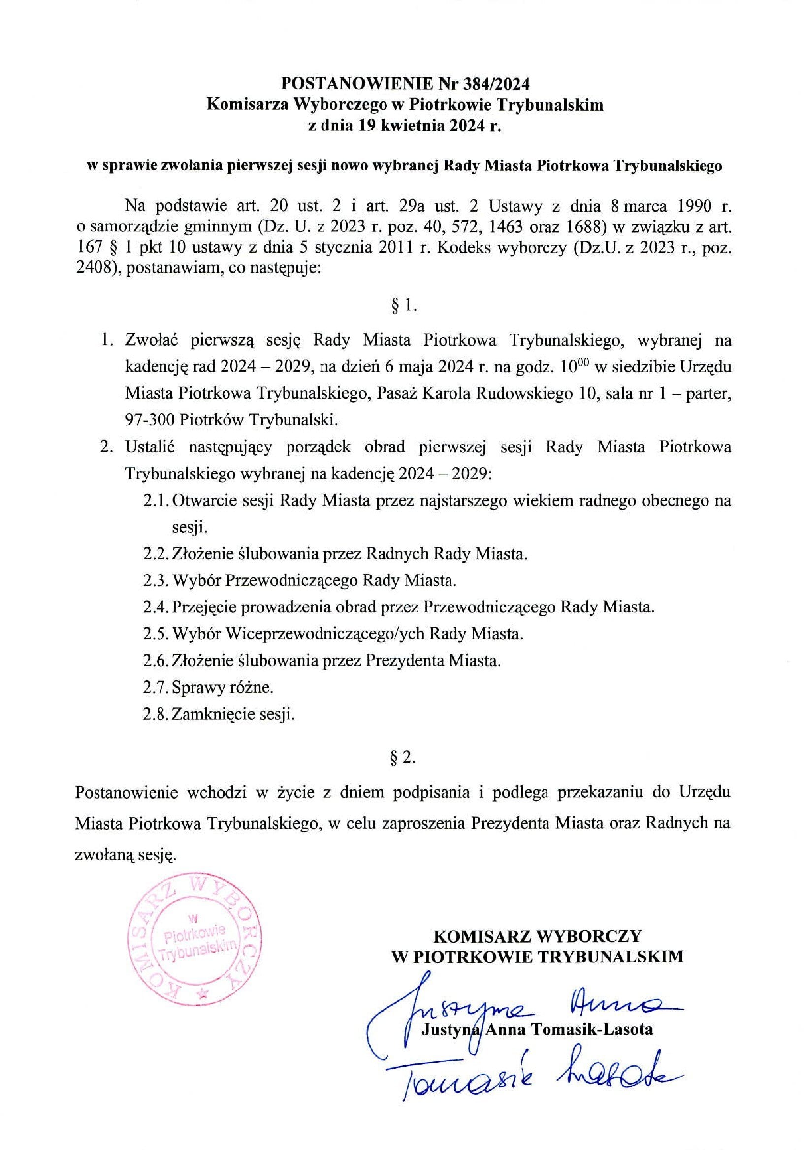 Zgodnie z postanowieniami Komisarza Wyborczego w Piotrkowie Trybunalskim w sprawie zwołania pierwszych sesji Rady Powiatu Piotrkowskiego oraz Rady Miasta Piotrkowa Trybunalskiego, kadencji przypadającej na lata 2024-2029, odbędą się one odpowiednio: 2 i 6 maja 2024 r.