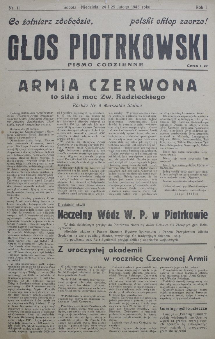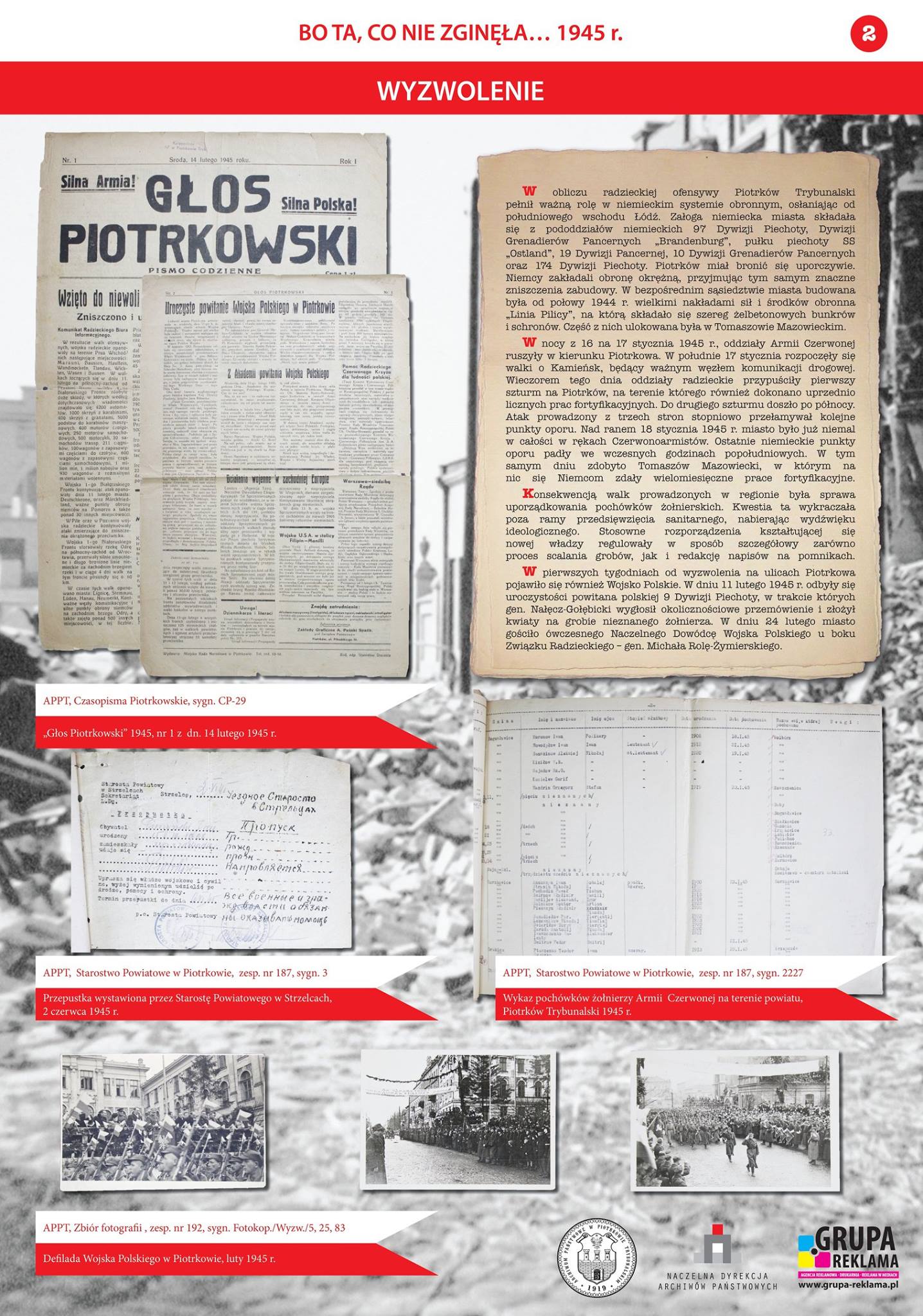 Przykłady ówczesnej piotrkowskiej prasy oraz zdjęć z początku 1945 r. pozwalają wczuć się w klimat tamtych dni. O walkach i ich ofiarach przypomina m.in. wykaz żołnierzy Armii Czerwonej, pochowanych wówczas na Placu Kościuszki w Tomaszowie Mazowieckim. Piotrkowski wątek swej kariery miał też Wojciech Jaruzelski, który w lipcu 1946 r. został mianowany wojskowym komendantem miasta.