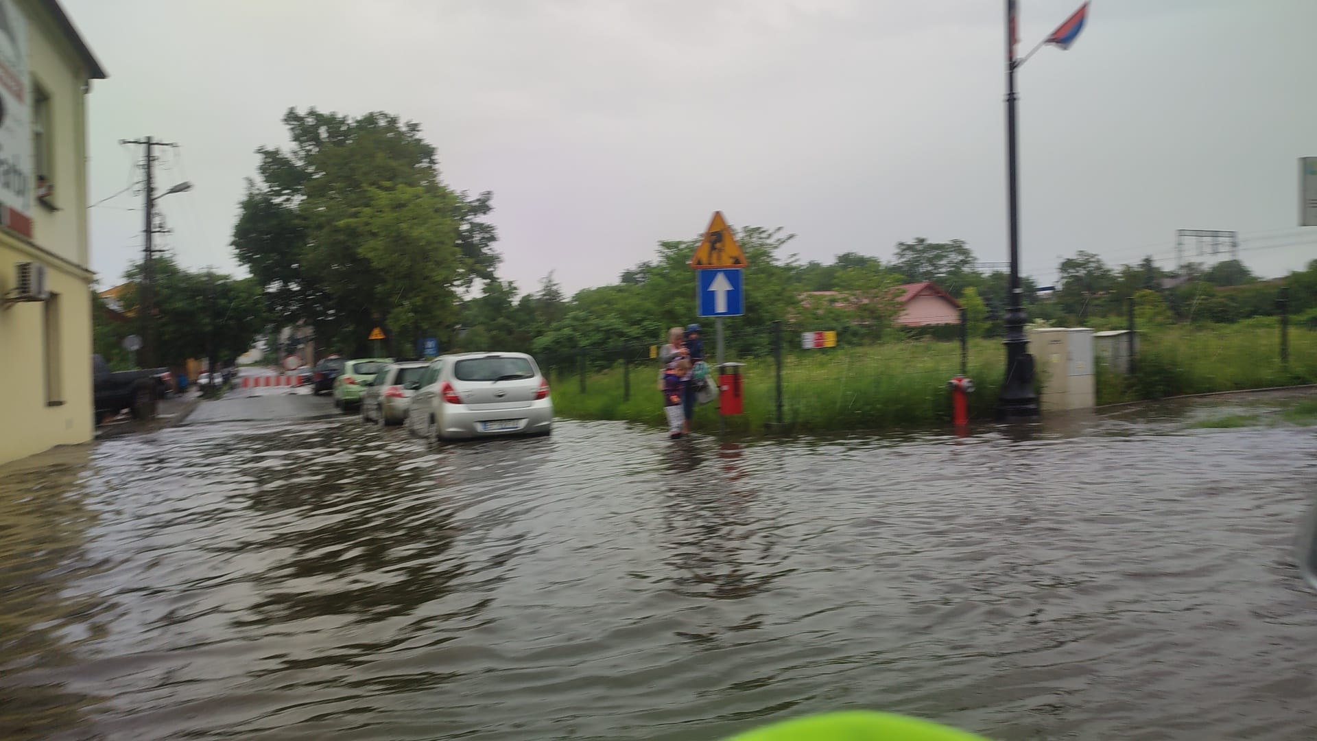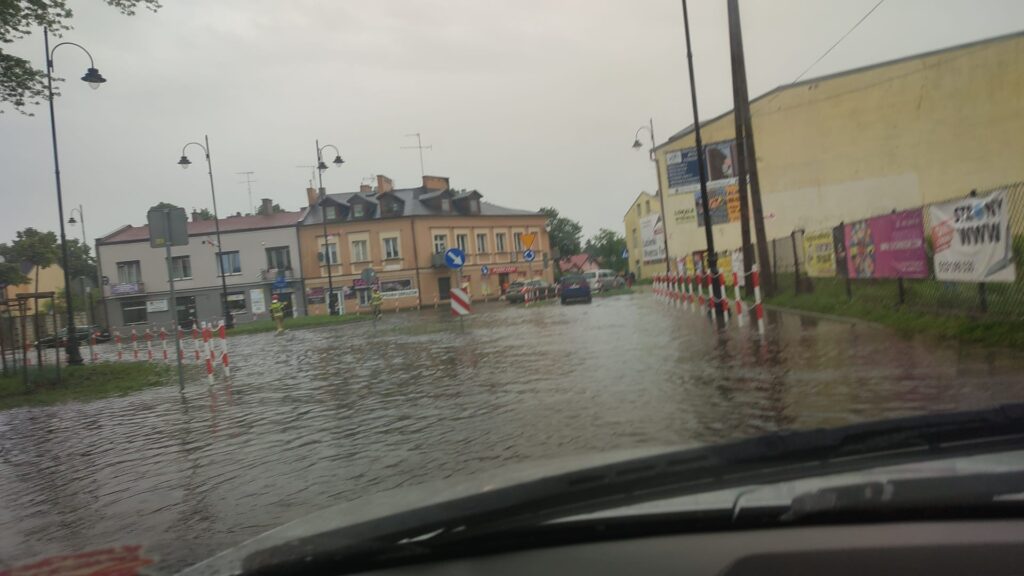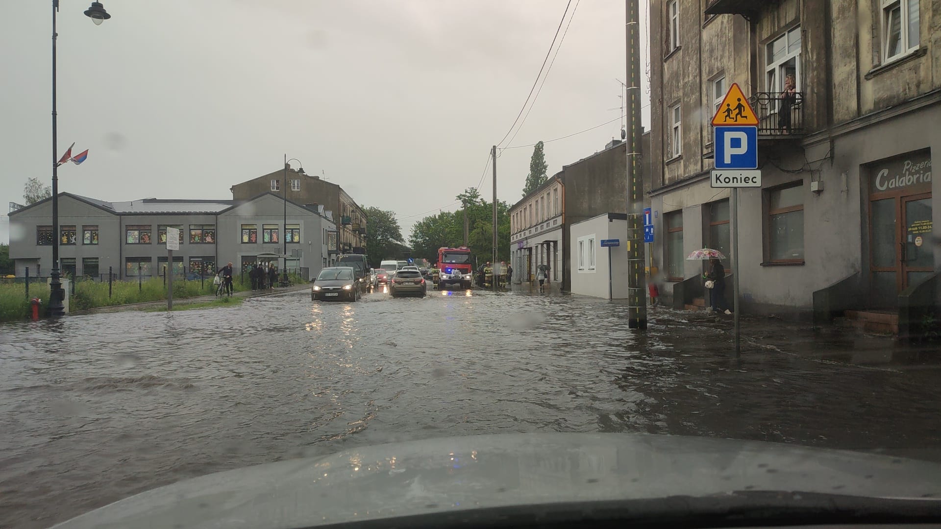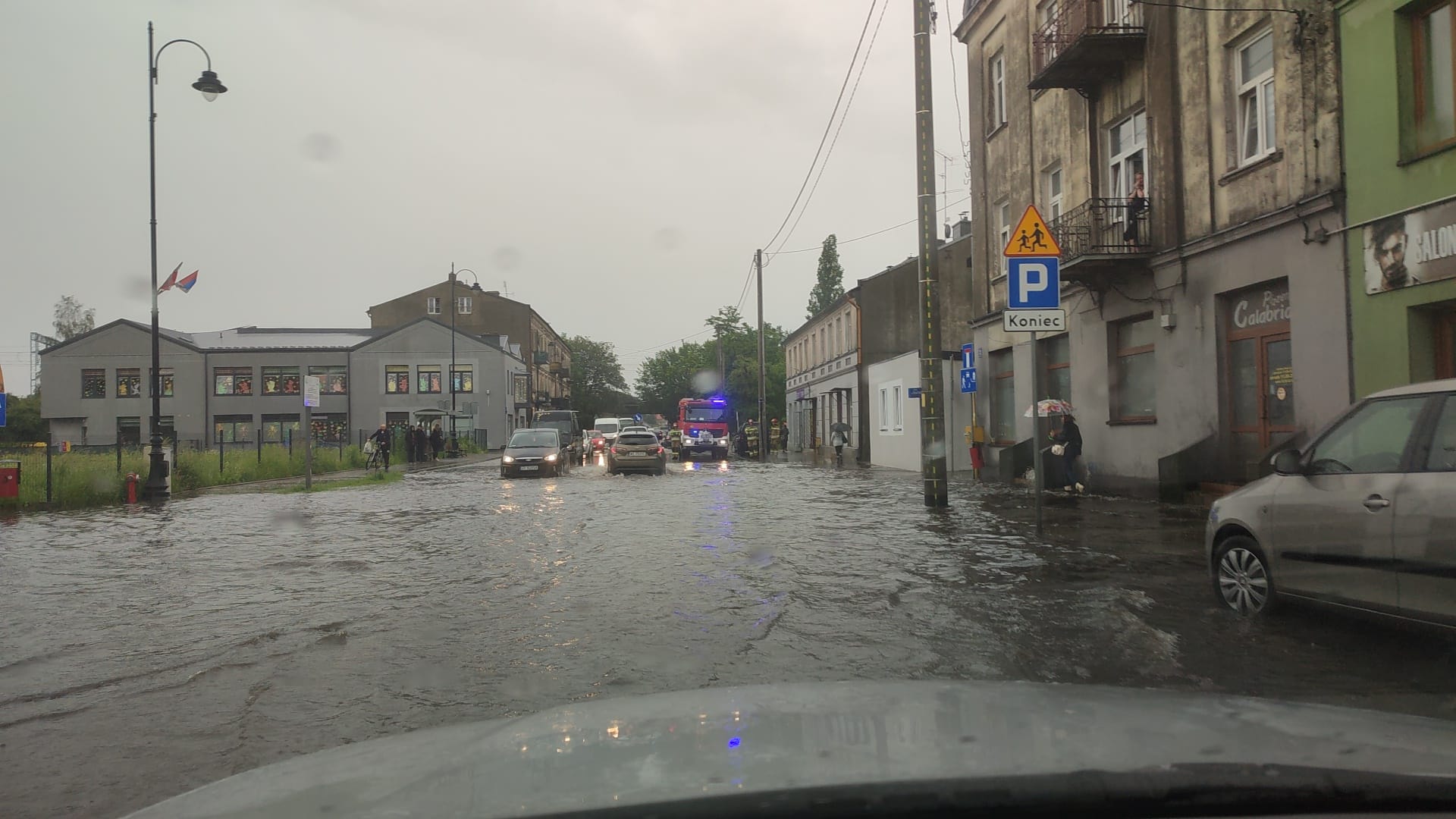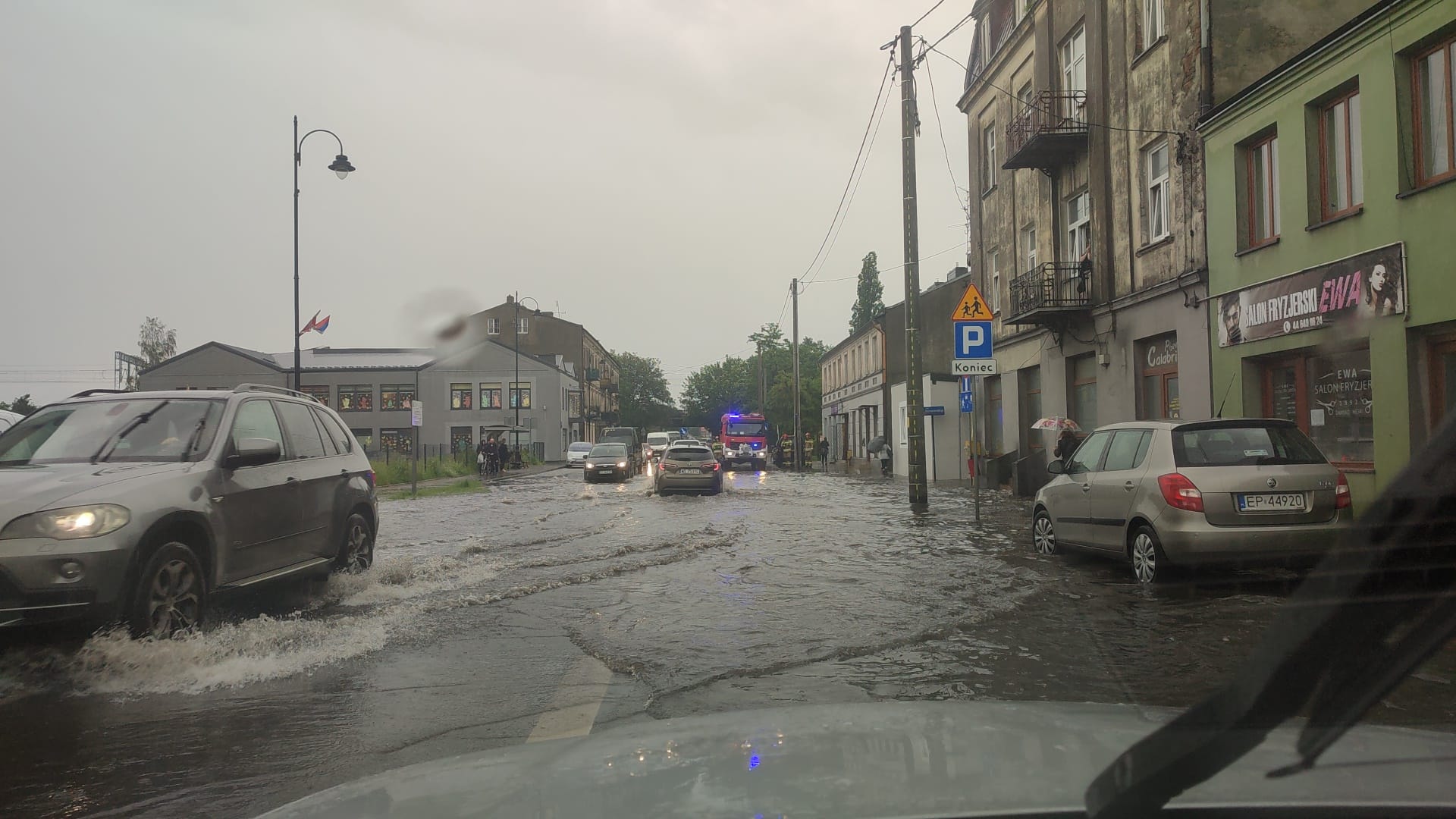 Rondo u zbiegu Wojska Polskiego, Łódzkiej i Polnej znowu kompletnie sparaliżowane. Intensywne opady deszczu zalały to skrzyżowanie. Woda wdziera się do sklepów i piwnic niektórych kamienic. Podobna sytuacja jest na ulicy Polnej.