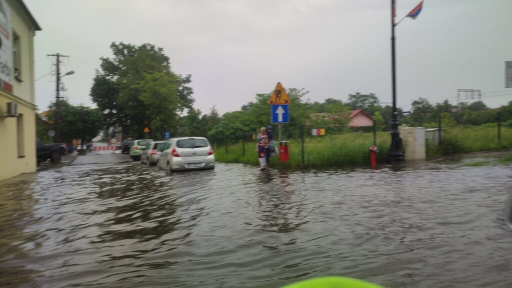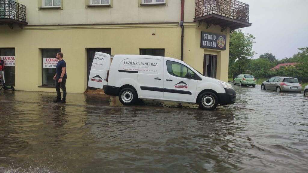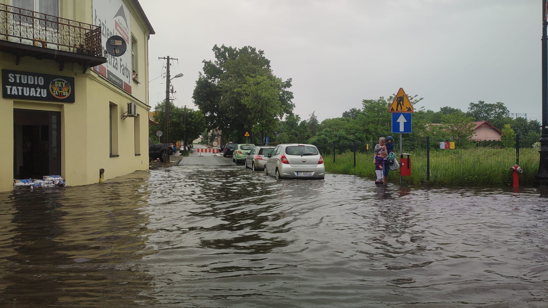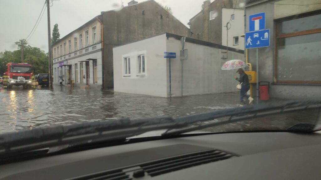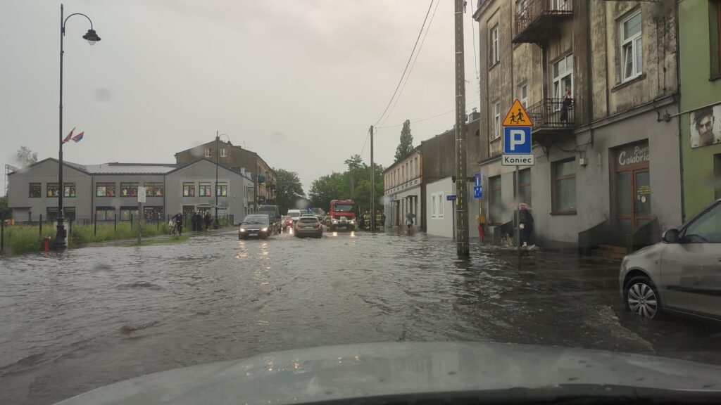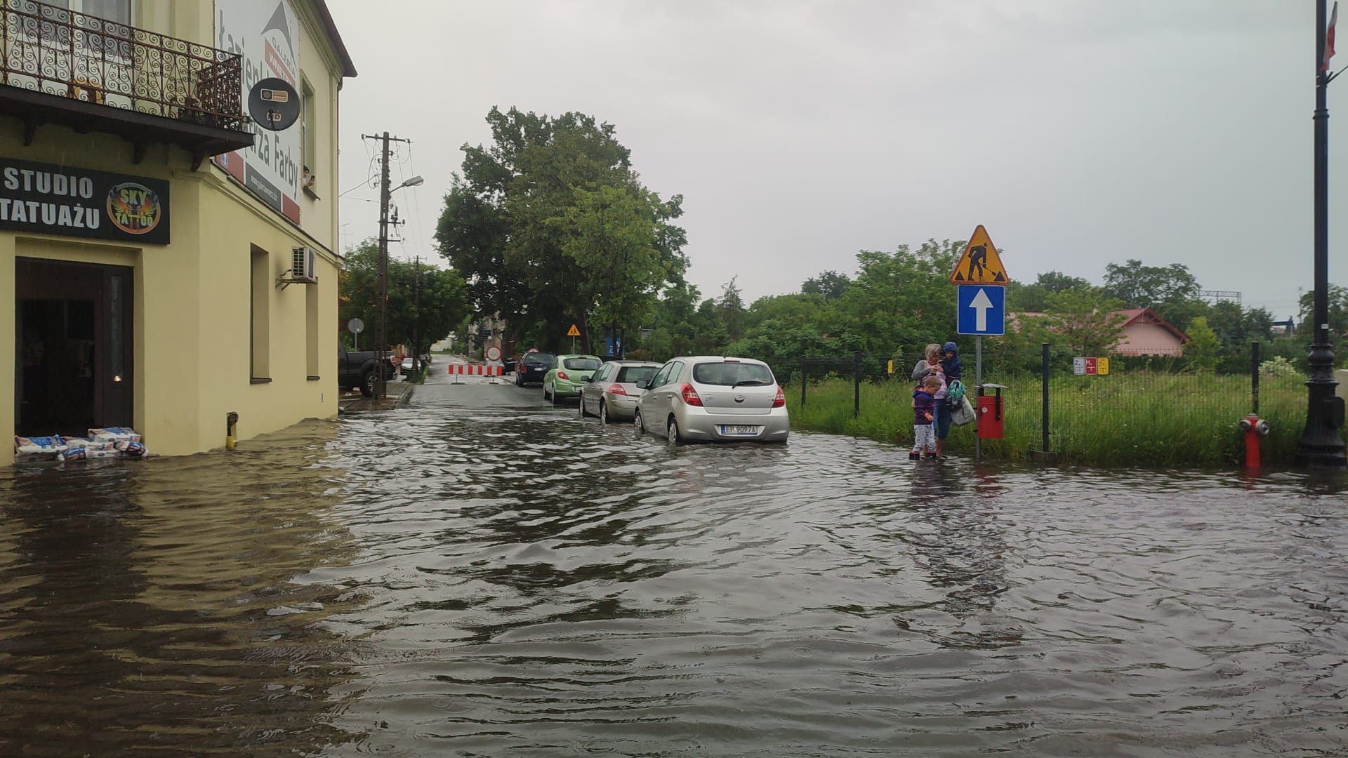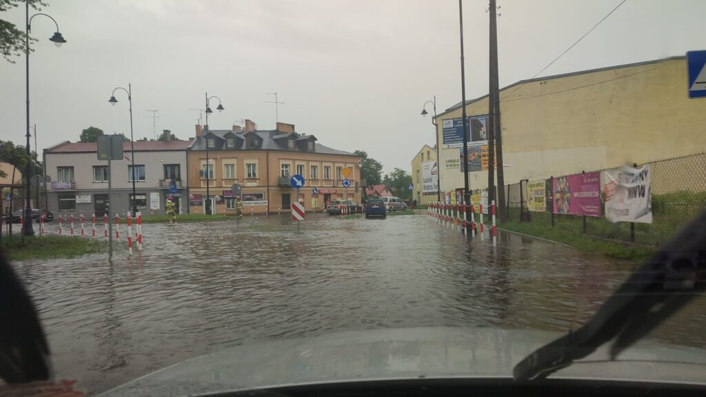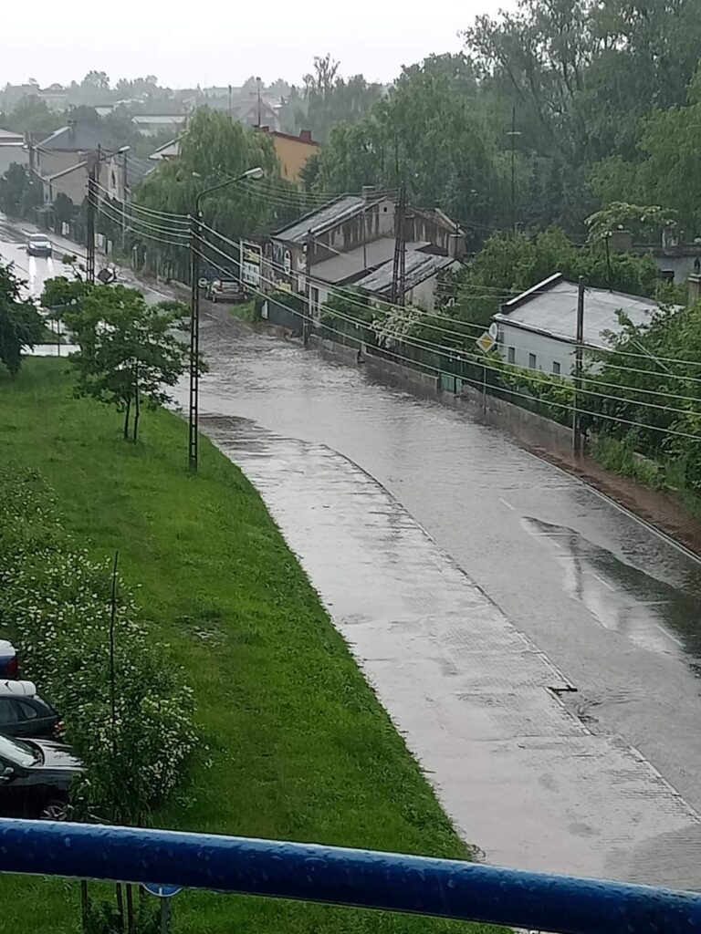 Rondo u zbiegu Wojska Polskiego, Łódzkiej i Polnej znowu kompletnie sparaliżowane. Intensywne opady deszczu zalały to skrzyżowanie. Woda wdziera się do sklepów i piwnic niektórych kamienic. Podobna sytuacja jest na ulicy Polnej.