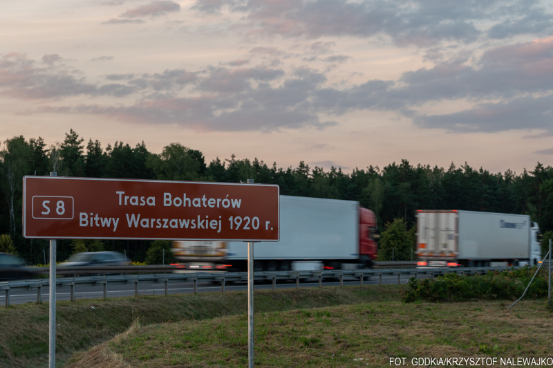 Przypomnijmy, droga krajowa nr 8 liczy blisko 830 km długości i łączy Kudowę Zdrój na granicy z Czechami z Budziskiem na granicy z Litwą. Od Wrocławia, przez Warszawę, do Białegostoku dojedziemy już drogą ekspresową S8, która ma ok. 560 km długości. Wzdłuż drogi ekspresowej ustawiono 90 tablic informujących o nowej symbolicznej nazwie trasy na pamiątkę przełomowej kampanii wojny polsko-rosyjskiej z lat 1919-1921. Bitwa Warszawska (13-25 sierpnia 1920 r.) była wielkim zwycięstwem Wojska Polskiego, które tocząc ciężkie walki powstrzymało i ostatecznie zmusiło do szybkiego odwrotu oddziały Armii Czerwonej.