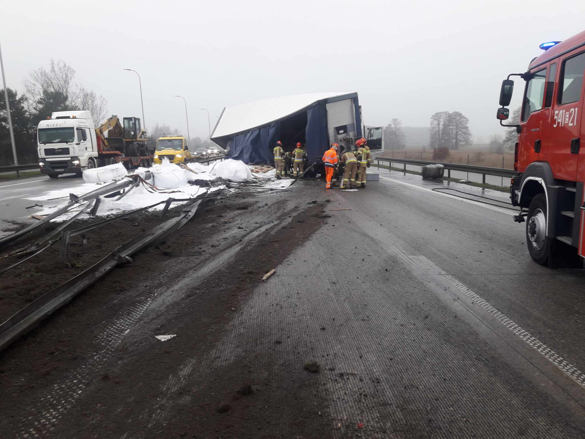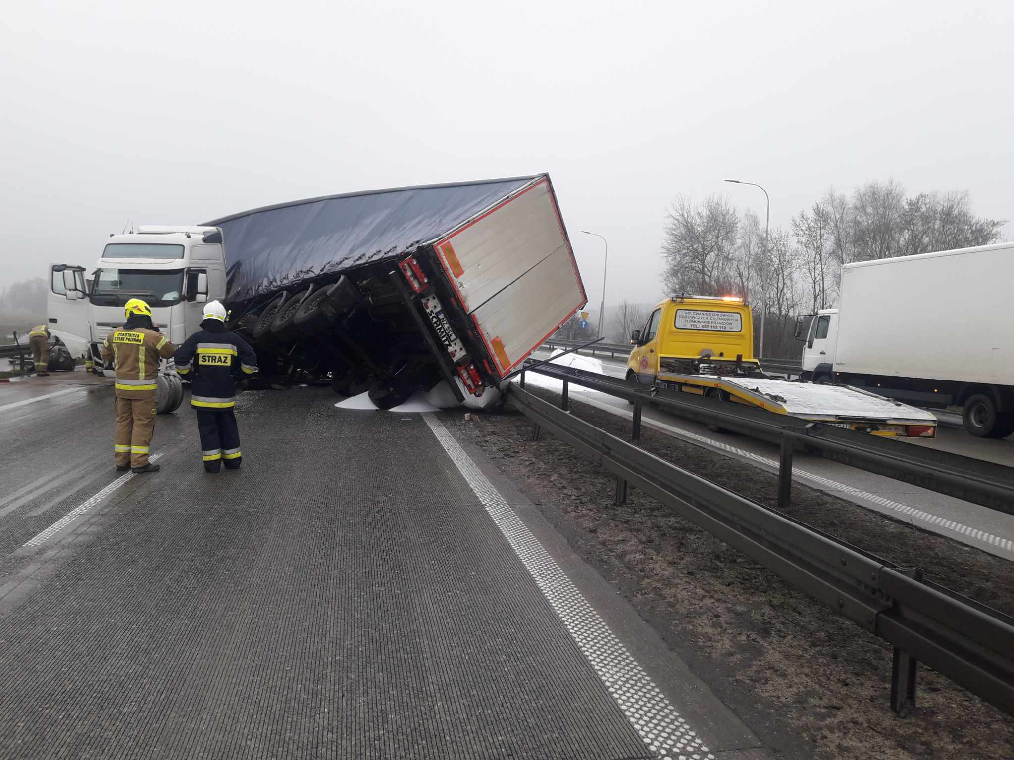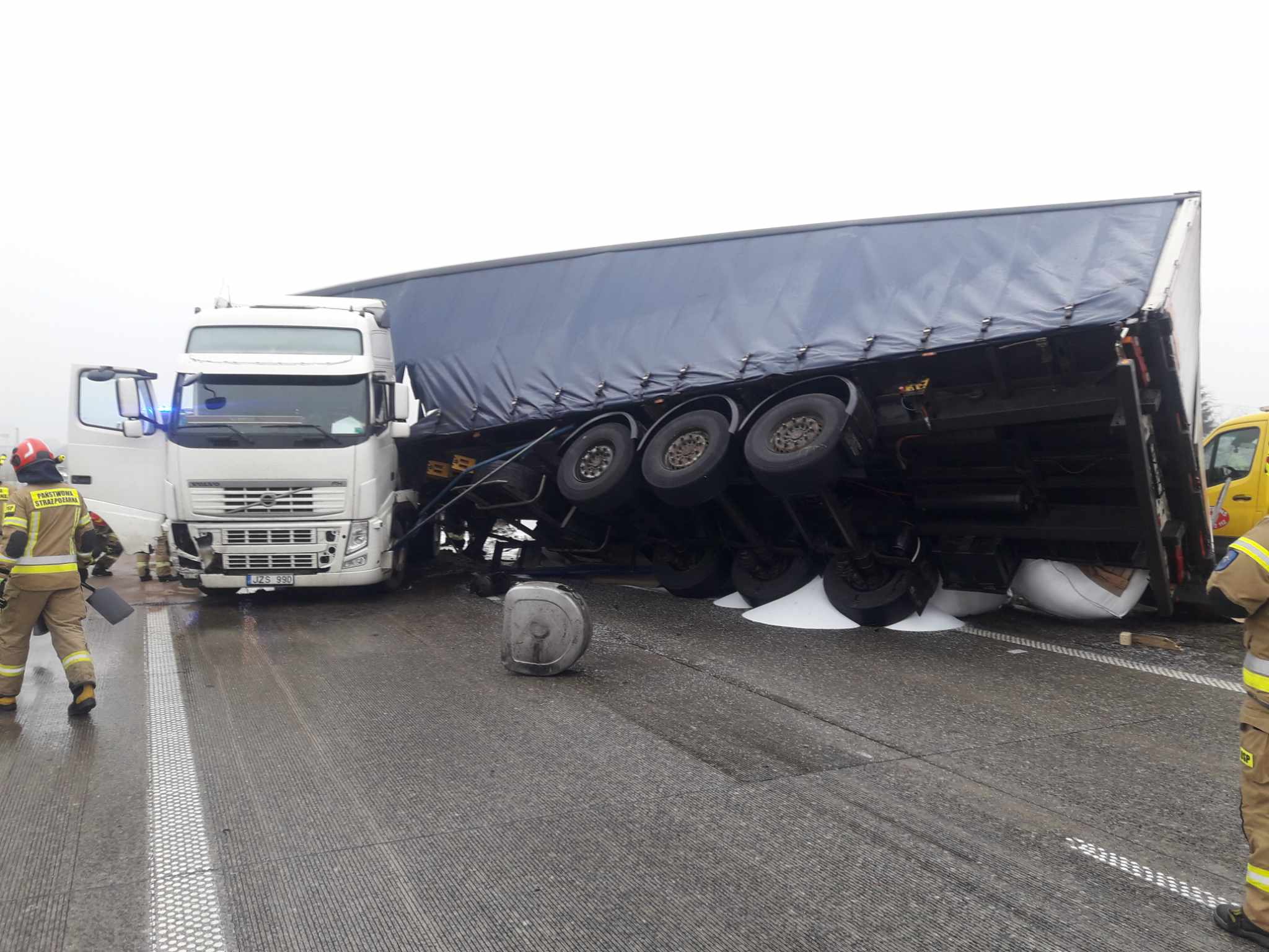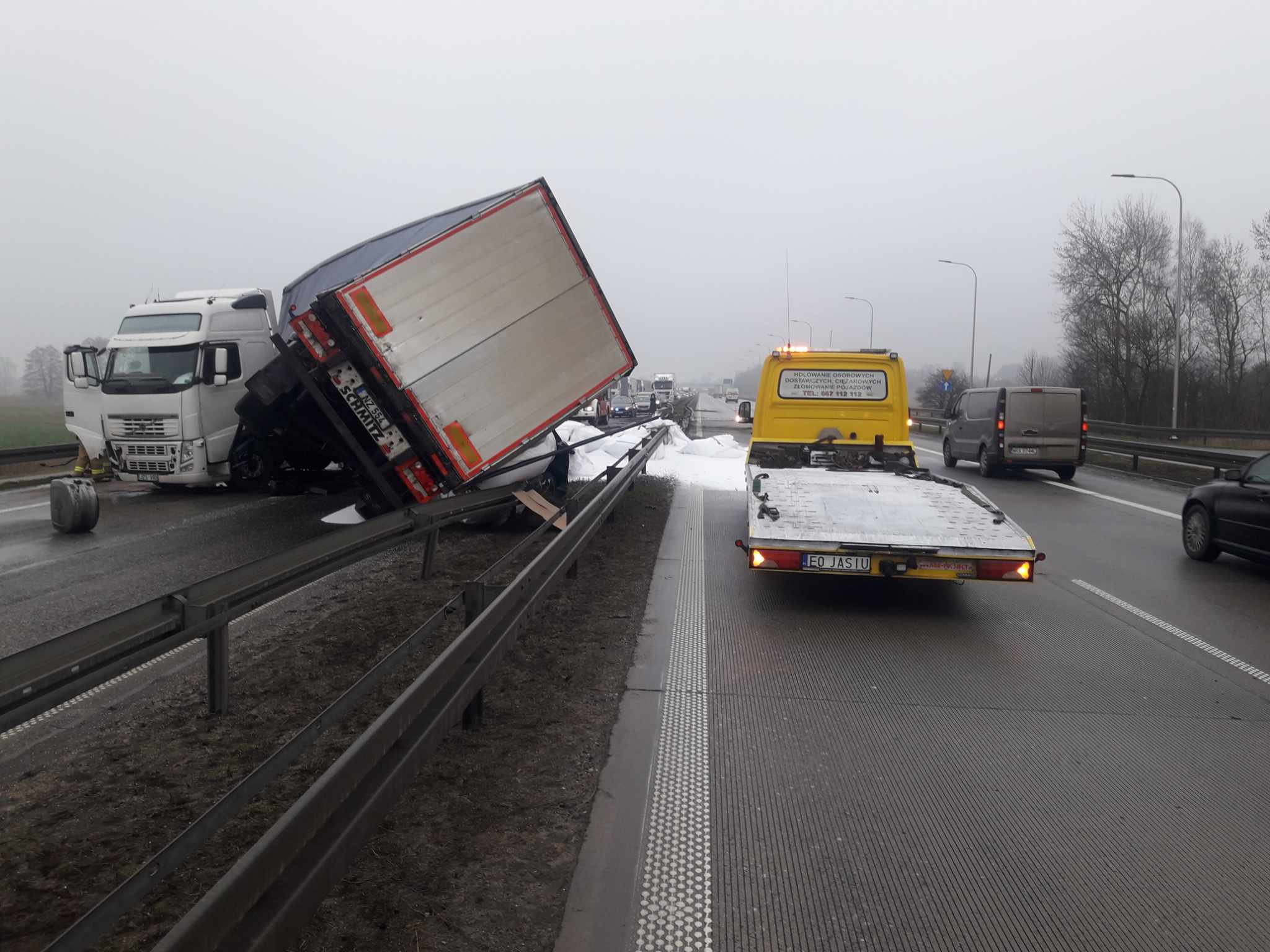 Do zdarzenia doszło w okolicy miejscowości Wiaderno, tuż za granicą powiatów piotrkowskiego i tomaszowskiego. Z naszych nieoficjalnych informacji wynika, że litewski kierowca prawdopodobnie stracił panowanie nad pojazdem, doprowadził do nagłego skrętu pojazdu i doszło do częściowego wywrócenia naczepy. Ładunek w postaci granulatu wysypał się na jezdnie. Potrzebny będzie specjalistyczny sprzęt by podnieść przyczepę a także uprzątnąć zniszczone bariery energochłonne.