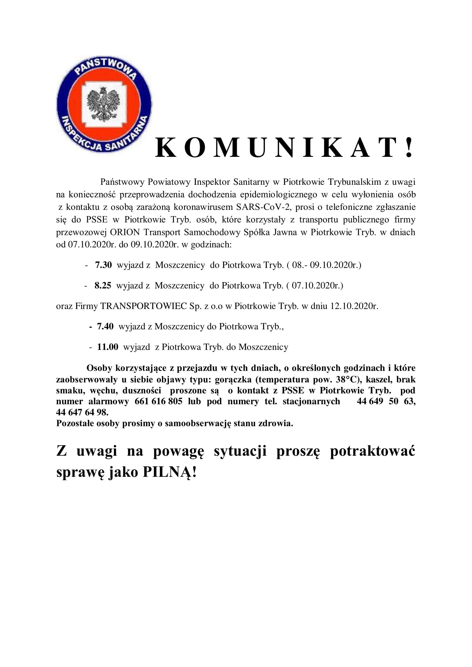 Osoby korzystające z przejazdu w tych dniach, o określonych godzinach i które zaobserwowały u siebie objawy typu: gorączka (temperatura pow. 38 st. C), kaszel, brak smaku, węchu, duszności proszone są o kontakt z PSSE w Piotrkowie Tryb. pod numer alarmowy 661 616 805 lub pod numery tel. stacjonarnych 44 649 50 63, 44 647 64 98.