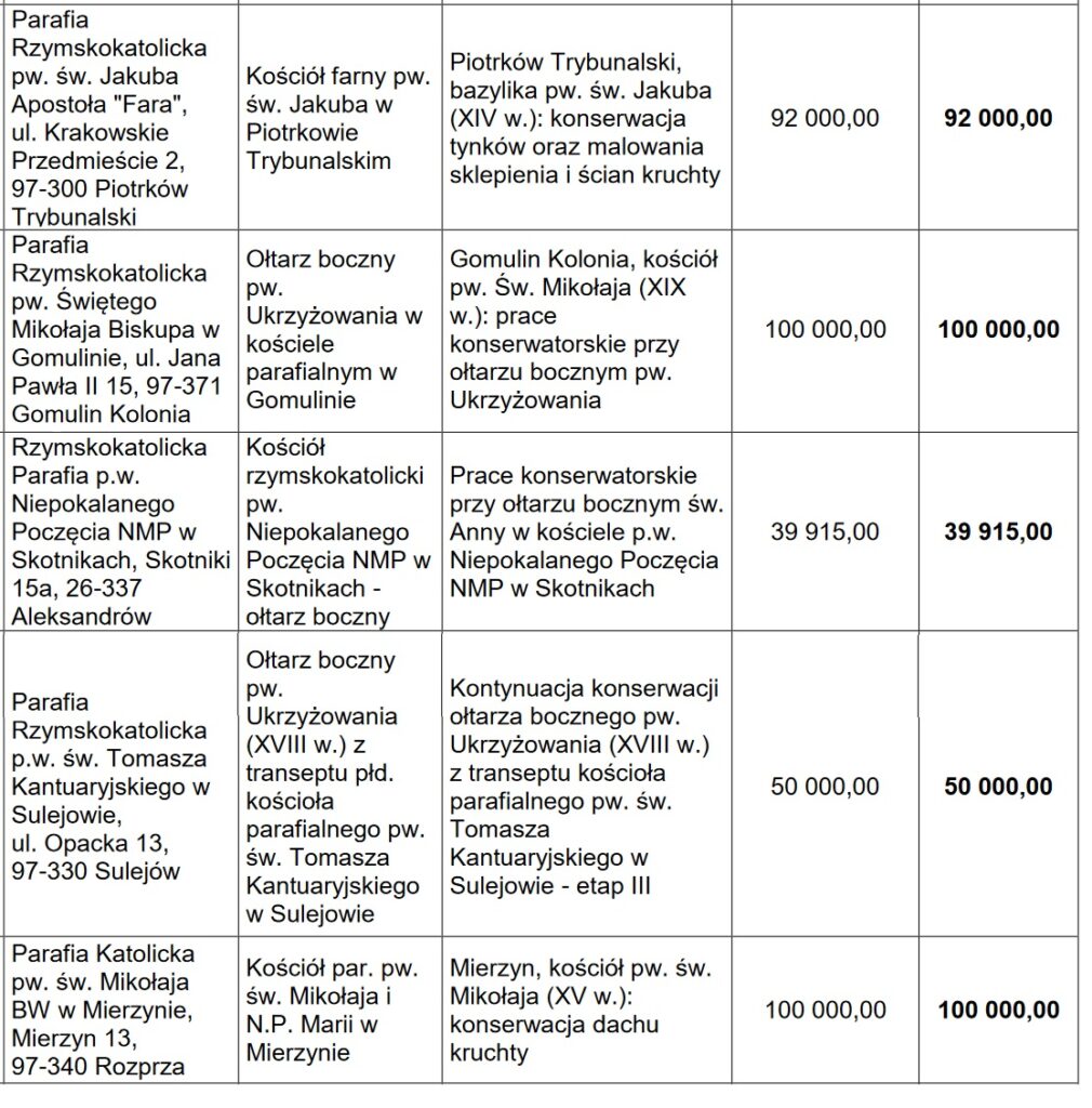 – Bazylika Mniejsza św Jakuba w Piotrkowie Trybunalskim – 92 000 zł na konserwację tynków oraz malowanie sklepienia i ścian