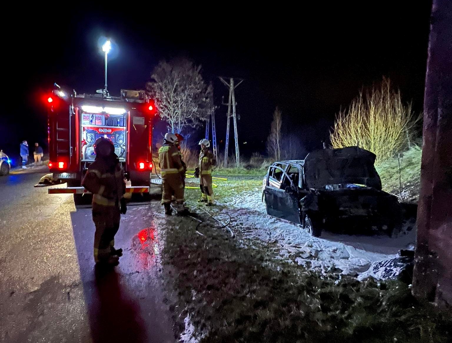 Do zdarzenia doszło we wtorek chwilę po 21:00 na drodze pomiędzy Wolą Krzysztoporską a Krężną w powiecie piotrkowskim. Kierowca jadąc od strony Woli, stracił panowanie nad pojazdem i uderzył w wiadukt kolejowy. W wyniku wypadku kierujący skodą złamał nogę, ale na szczęście z pomocą przypadkowych osób udało mu się opuścić pojazd. Zderzenie z betonowym wiaduktem spowodowało zapalenie się silnika, a w konsekwencji pożar całego pojazdu. Niestety strażakom nie udało się ugasić ognia. Skoda spłonęła doszczętnie.