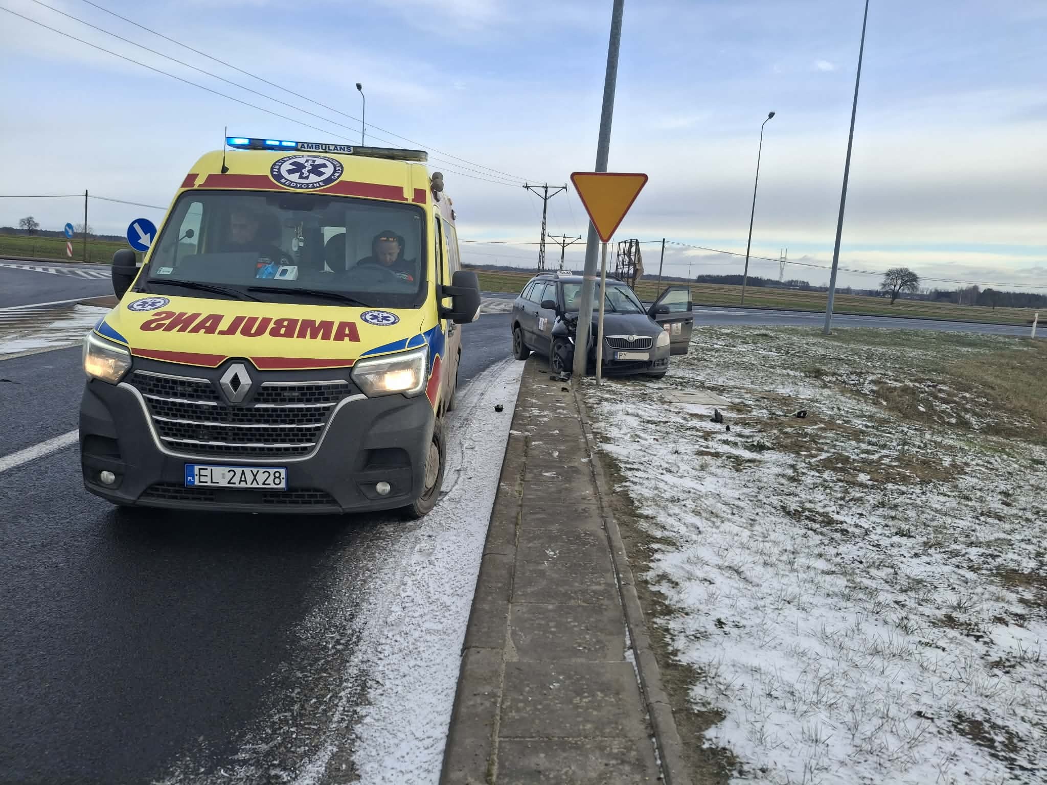 Na miejscu pojawiły się służby, w tym załoga pogotowia ratunkowego. Ratownicy medyczni przebadali mężczyznę na miejscu – skończyło się na strachu i drobnych potłuczeniach. Kierujący nie wymagał hospitalizacji i mógł zostać na miejscu zdarzenia.