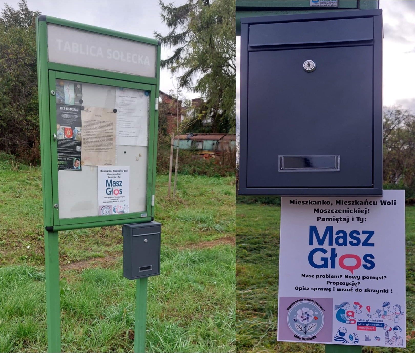 Skrzynka znajduje się na tablicy ogłoszeń przy skrzyżowaniu ul. Polnej i Gazomskiej (dawna działka po stawie strażackim). Zakupił ją sołtys Woli Moszczenickiej – Mariusz Stus. Jej zawartość będzie sprawdzana co najmniej dwa razy w miesiącu – częściej, jeśli pojawi się więcej korespondencji. Opinie można składać anonimowo, a dane kontaktowe – jeśli ktoś je zostawi – nie będą udostępniane osobom trzecim. Zgłoszenia będą analizowane przez sołtysa, Radę Sołecką i członków grupy Wola Działania, a najlepsze pomysły – w miarę możliwości – wcielane w życie.