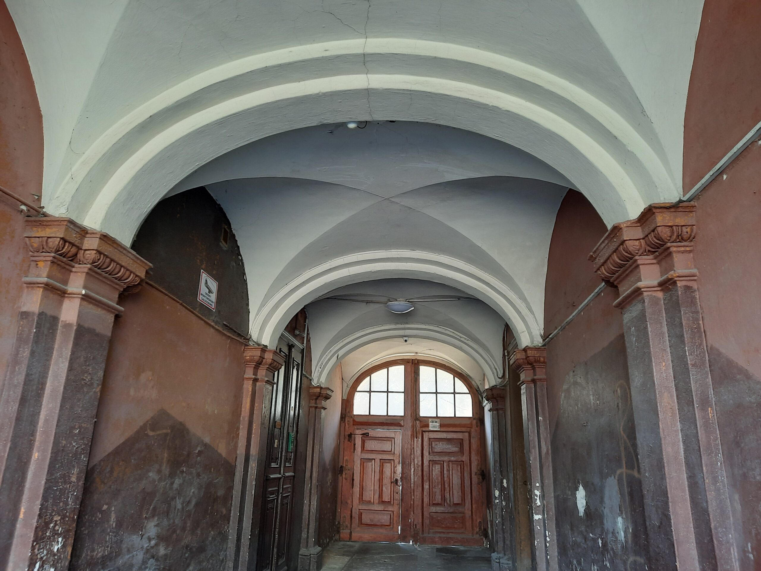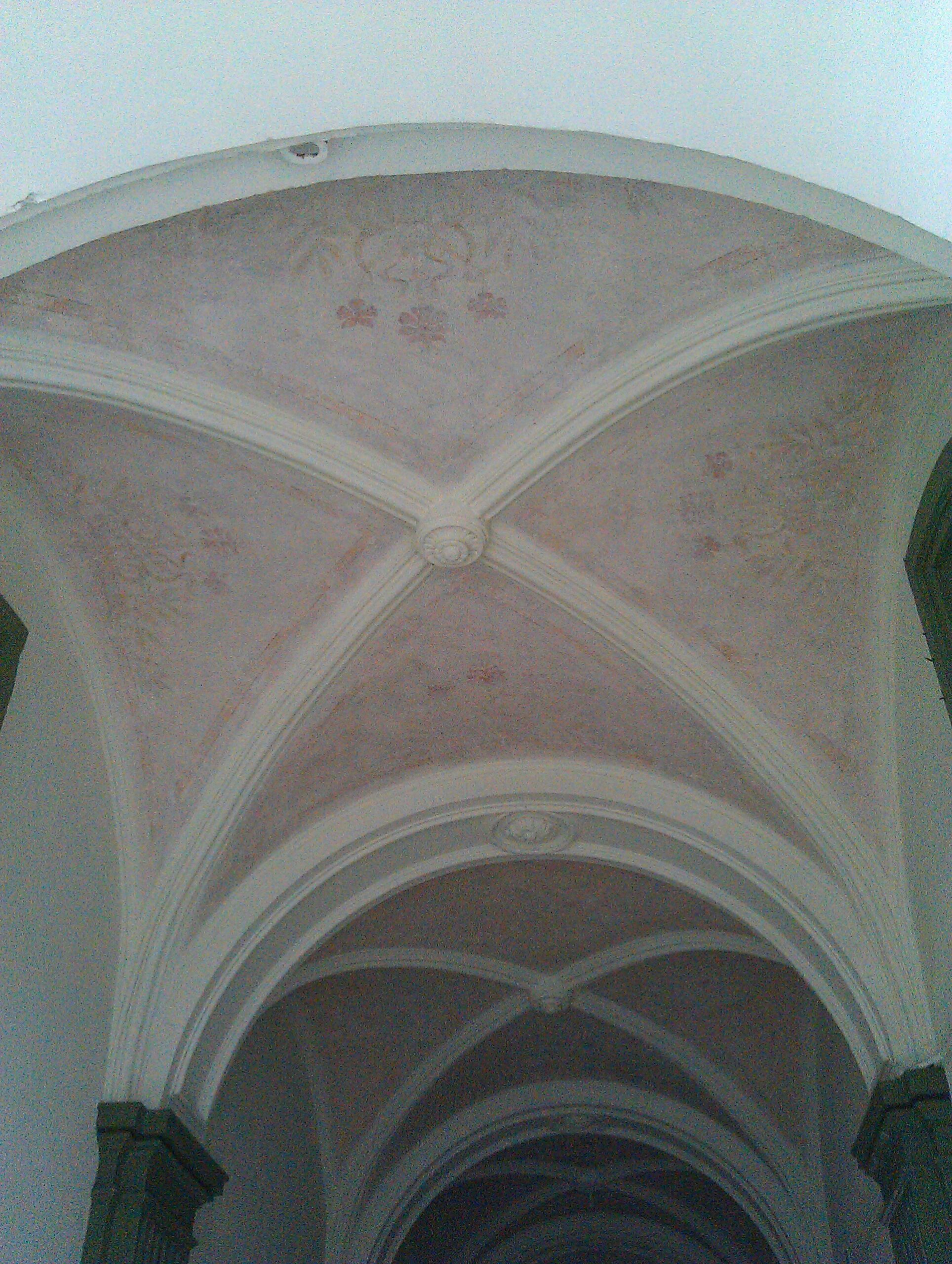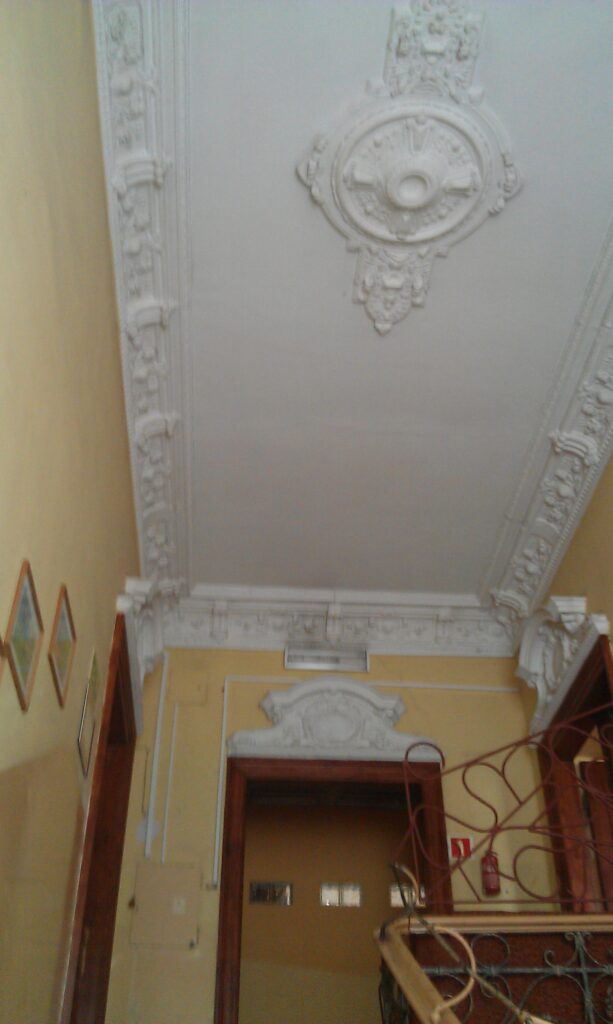 - Fragment pozostałości malowideł sufitowych na klatce schodowej w kamienicy przy al. 3 Maja 23 – dziś zamalowane
