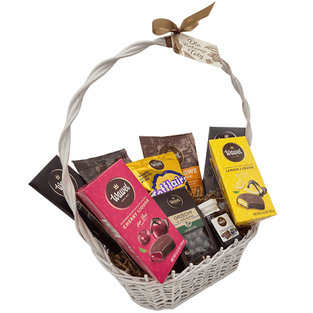 Przykładem takiego zestawu jest Kosz prezentowy Słodyczy Dla Taty. Znajdują się w nim Trufle z Wawelu (245 g), Czekolada Gorzka Premium 64% (90 g), Bombonierka Czekoladki nadziewane Malaga, Tiki Taki i Kasztanki (169 g), Czekolada nadziewana Peanut Butter (87 g) oraz trzy MINIczekolady – Choco (40 g), Peanut Butter (37 g) i Toffi (41 g). To wysokiej jakości słodycze, pośród których są zarówno klasyki, jak i nowości, tworzące razem jedną spójną całość.