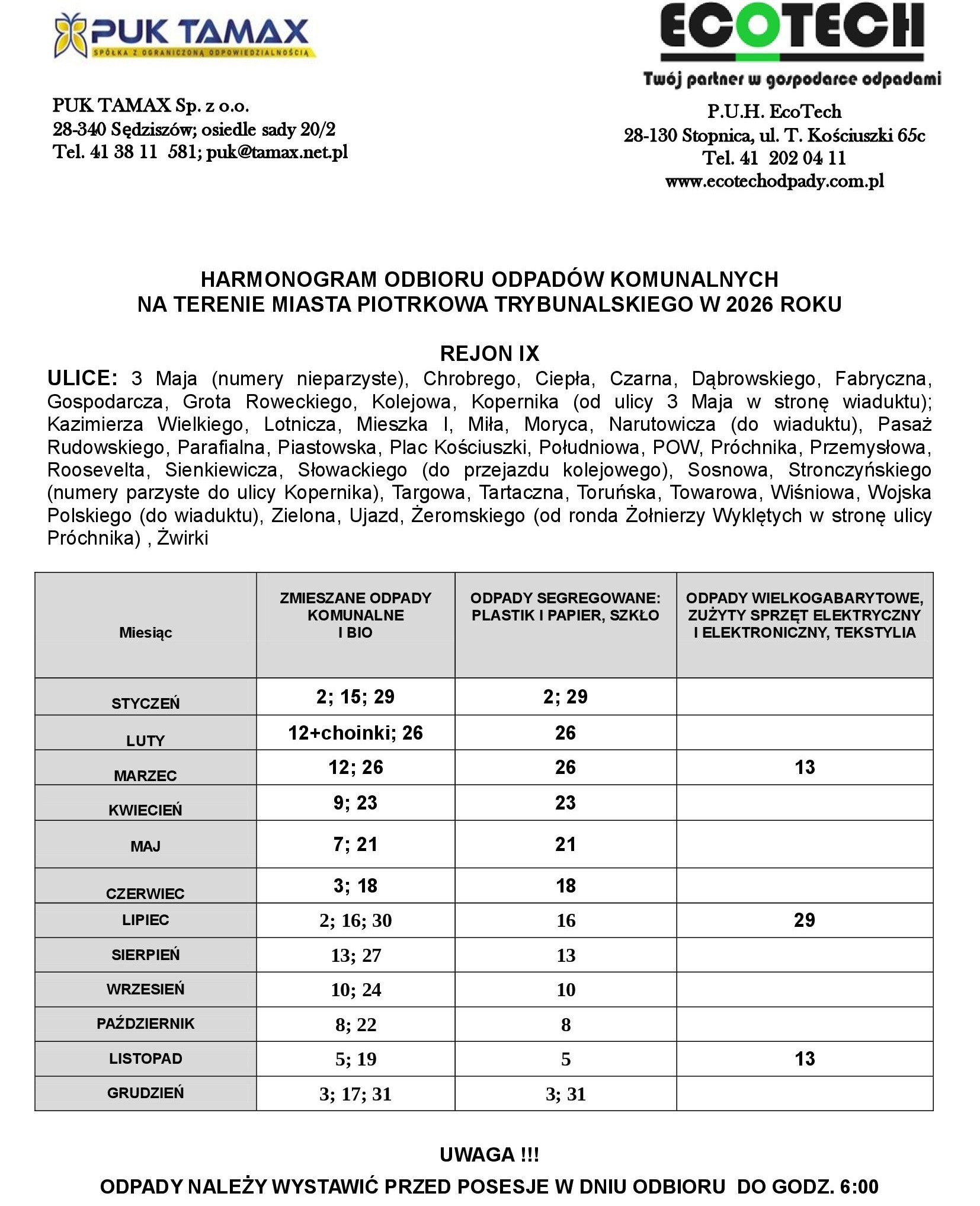 - Z domów jednorodzinnych: odpady odbierane są 2 razy w miesiącu.