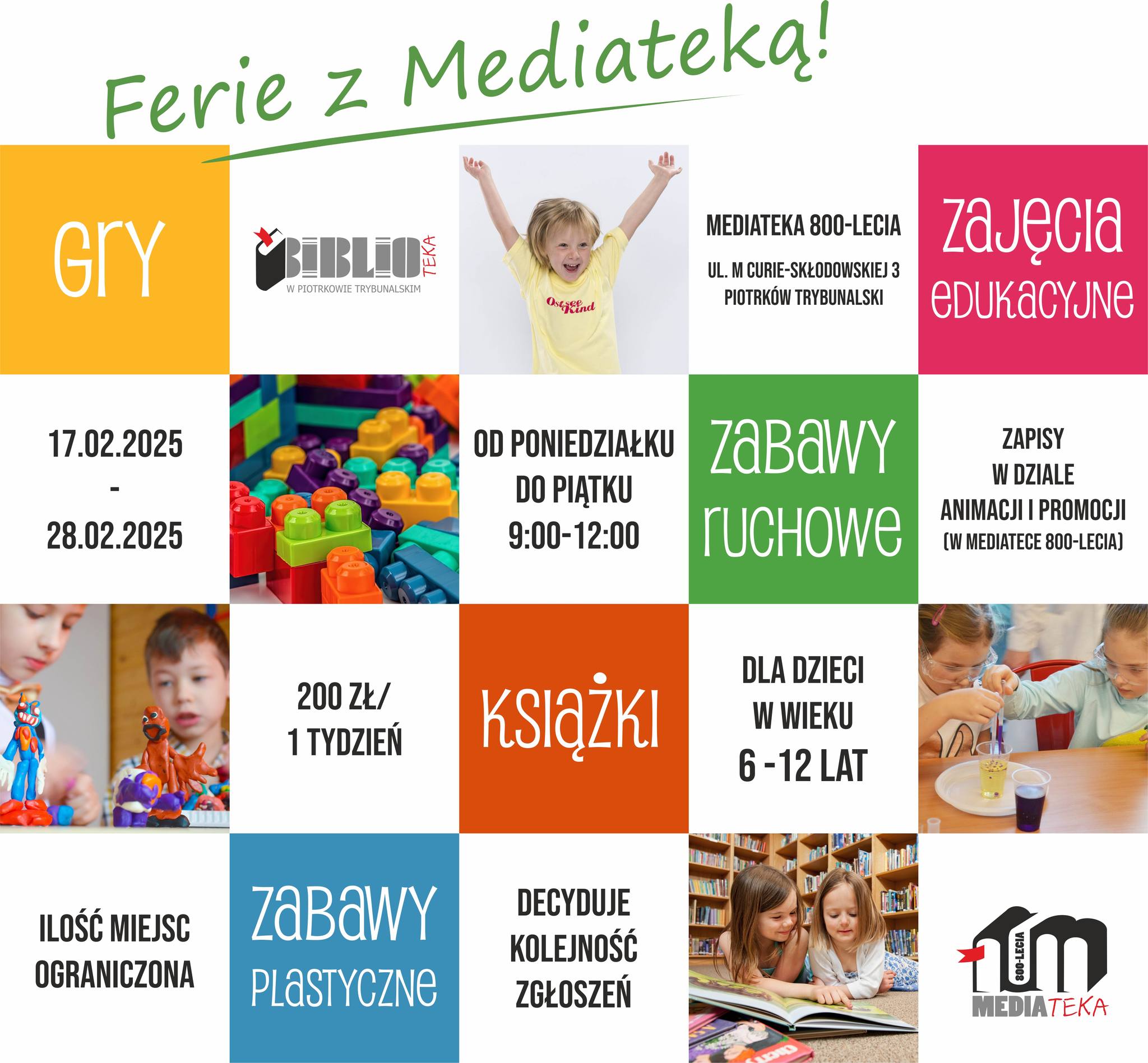 Mediateka 800-lecia również zaprasza wszystkie dzieci w wieku 6-12 lat do wspólnej zabawy i nauki. Zajęcia będą się odbywać od 17 do 28 lutego (od poniedziałku do piątku), w godzinach 9:00–12:00. W programie m.in. gry i zabawy, warsztaty plastyczne, wspólne czytanie, zajęcia edukacyjne i wiele innych atrakcji. To doskonała okazja, by rozwinąć pasje, poznać nowych przyjaciół i zrealizować twórcze pomysły. Koszt udziału to 200 zł za tydzień.