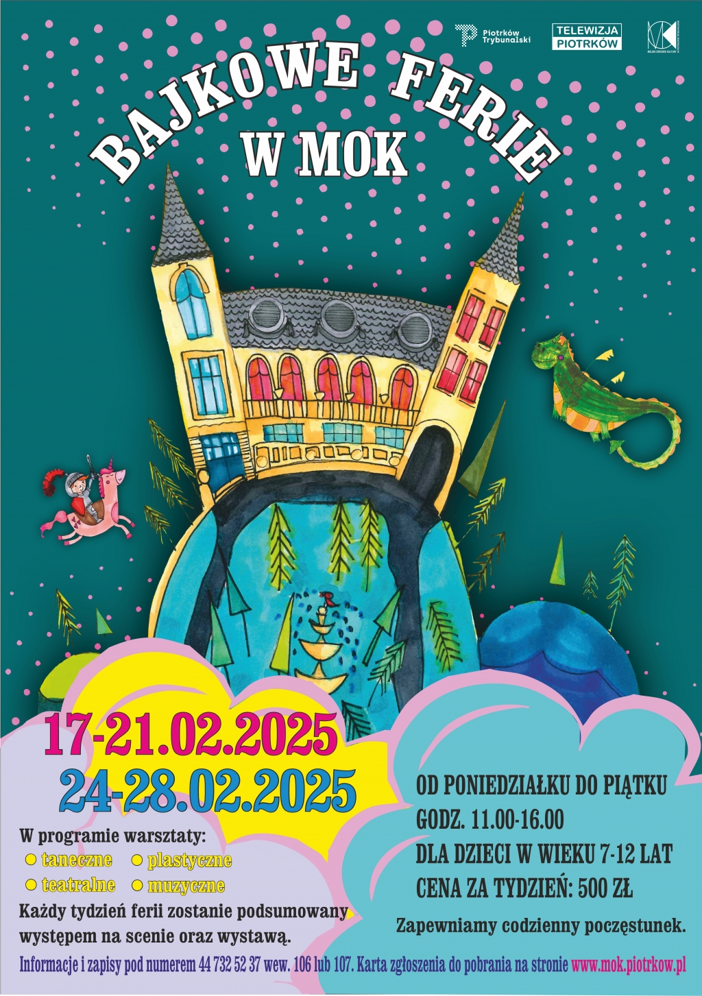 Miejski Ośrodek Kultury zaprasza wszystkie dzieci w wieku 7-12 lat na „Bajkowe ferie w MOK”. W programie dwóch turnusów (17-21 lutego i 24-28 lutego) znajdują się liczne warsztaty artystyczne, w tym teatralne, plastyczne, muzyczne i taneczne. Każdego dnia na uczestników czeka codzienny poczęstunek oraz wyjątkowy pokaz na scenie i wystawa powarsztatowa, które odbywają się w piątki. Zajęcia będą trwać od 11:00 do 16:00, a koszt jednego turnusu wynosi 500 zł. Więcej informacji (TUTAJ).