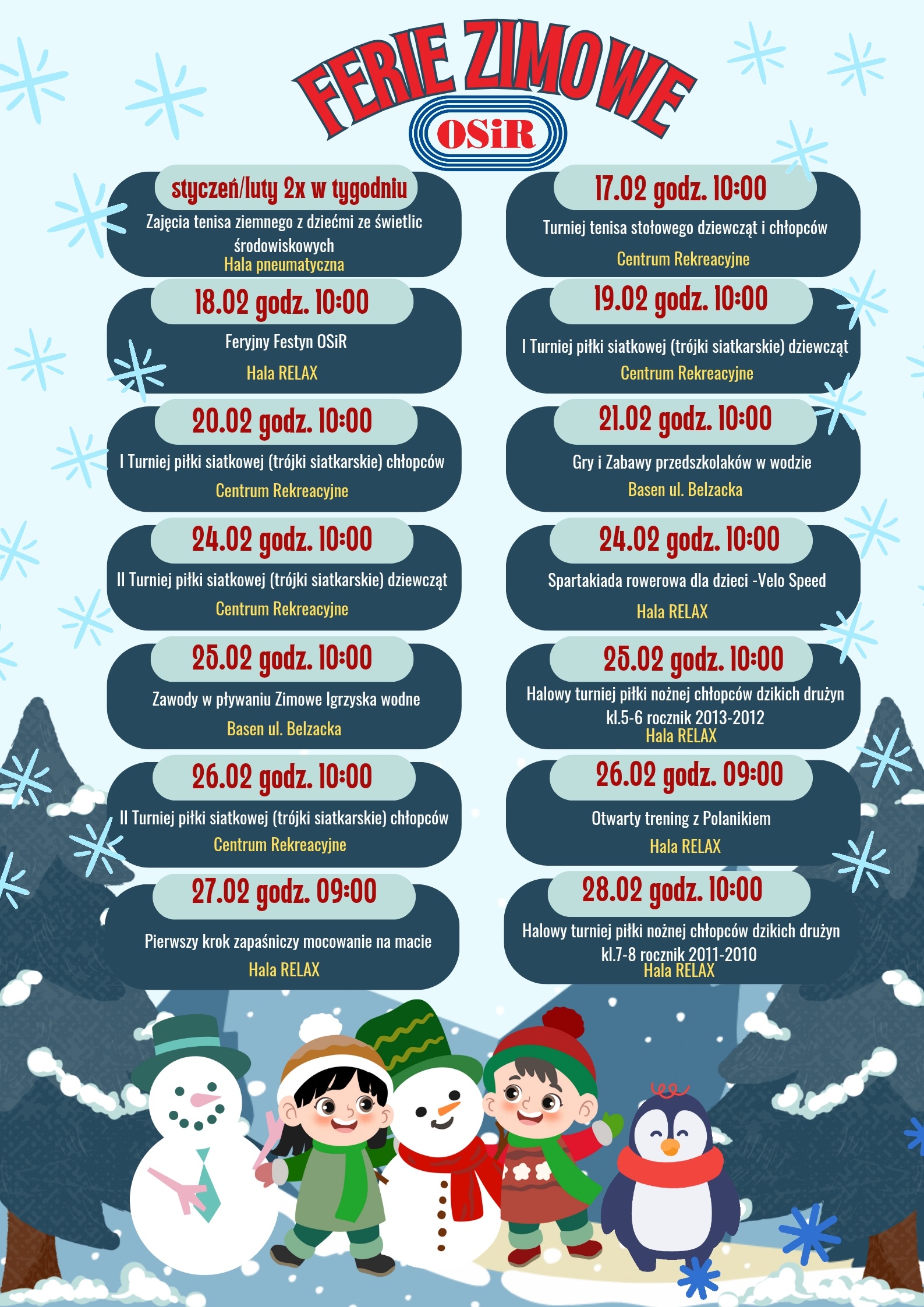 Zbliżające się ferie to świetna okazja, by spędzić czas aktywnie z Ośrodkiem Sportu i Rekreacji. OSiR przygotował bogaty program, który z pewnością zainteresuje każdego młodego sportowca. W programie znalazły się m.in.: