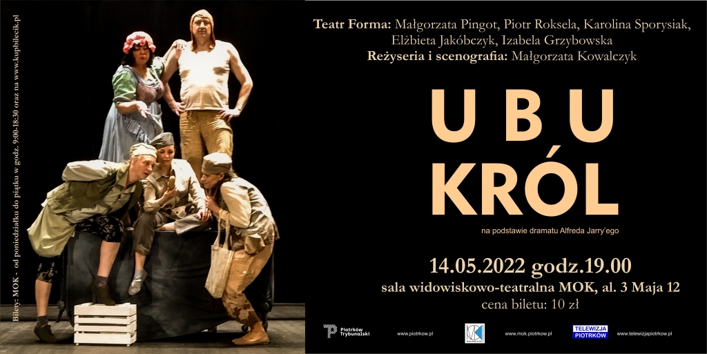Zapraszamy na przedstawienie „Ubu Król” w reżyserii Małgorzaty Kowalczyk. W roli aktorów zobaczymy: Małgorzatę Pingot, Piotra Rokselę, Karolinę Sporysiak, Elżbietę Jakóbczyk oraz Izabelę Grzybowską. Spektakl odbędzie się 14 maja, o godzinie 19:00. Bilety w cenie 10 złotych, do nabycia w kasie MOK lub na platformie kupbilecik.pl.