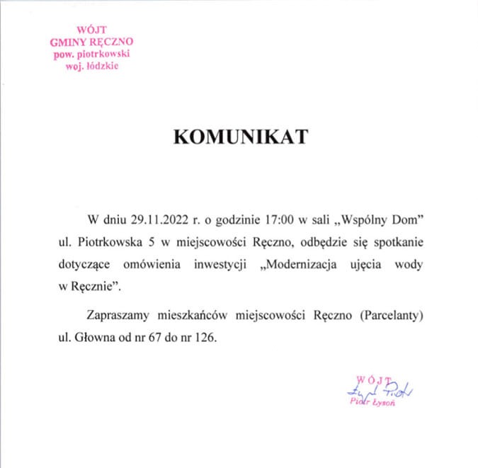 To jedna z najważniejszych inwestycji w ostatnich latach w gminie Ręczno. Samorząd przystąpił zarówno do modernizacji oczyszczalni ścieków, części sieci wodociągów gminnych, a także ujęcia wody w Ręcznie. Spotkanie w sprawie tych ostatnich robót odbędzie się w sali „Wspólny Dom” we wtorek 29 listopada.