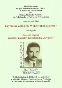 Miejska Biblioteka Publiczna oraz Klub historyczny im. Stefana Roweckiego „Grota”, zapraszają na spotkanie pt. „Czy walka żołnierzy Wyklętych miała sens?”. Wykład wygłosi Kajetan Rajski z kwartalnika „Wyklęci”. Spotkanie odbędzie się 28 lutego w czytelni MBP. Początek o 11:30.