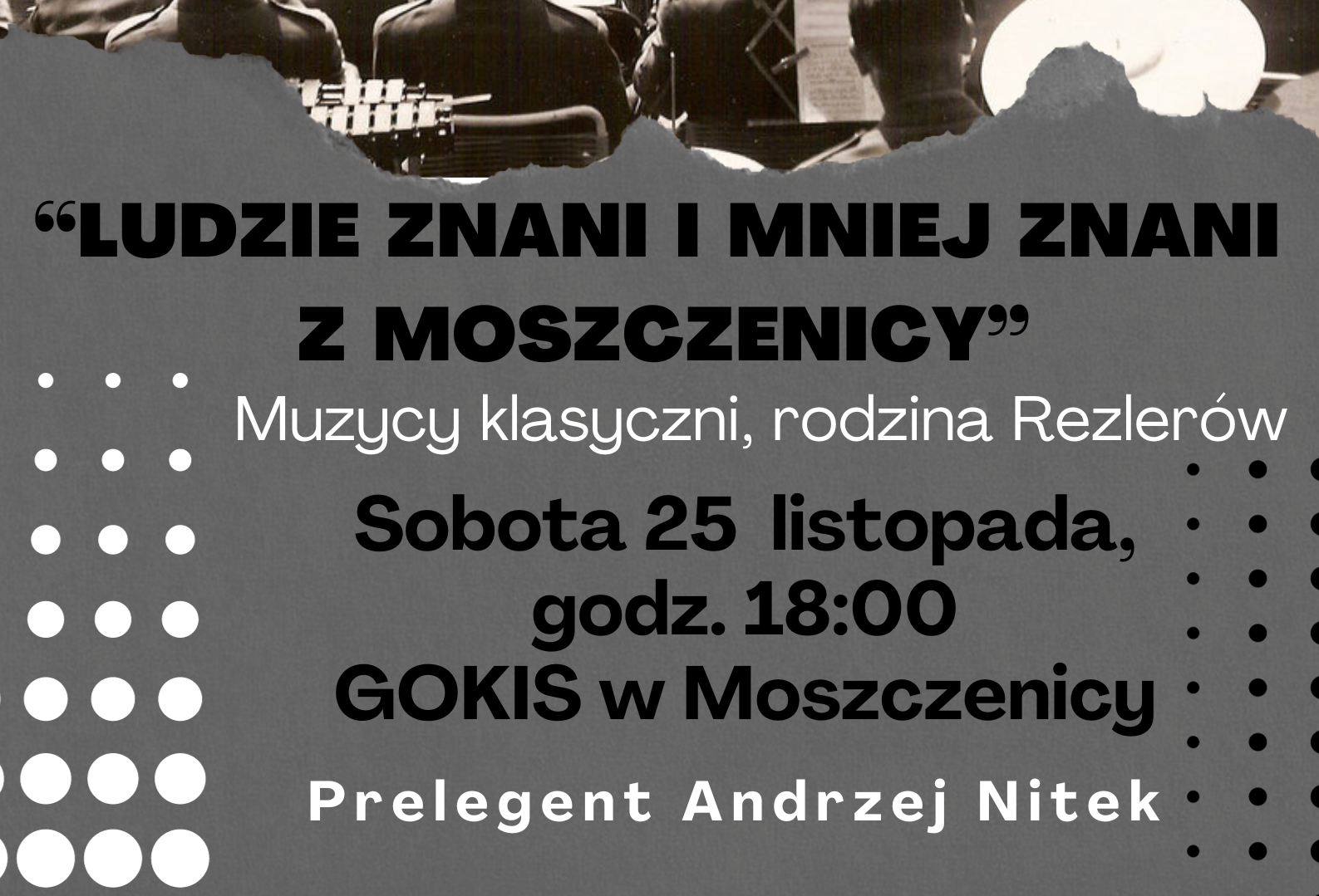 Gminny Ośrodek Kultury i Sportu im Jana Justyny w Moszczenicy zaprasza na wykład historyczny pt. „Ludzie znani i mniej znani z Moszczenicy – Muzycy klasyczni, rodzina Rezlerów”. Wykład odbędzie się w sali widowiskowej GOKiS 25 listopada o godz. 18:00. Prelegentem będzie mieszkaniec gminy Moszczenica, regionalista – Andrzej Nitek.