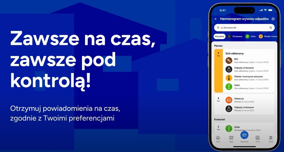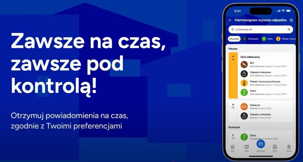 Zamiast szukać informacji na stronach internetowych urzędu czy firm wywozowych, mieszkańcy mają dostęp do harmonogramu wywozu śmieci bezpośrednio w aplikacji mobilnej. Po zalogowaniu się do aplikacji wystarczy wskazać adres zamieszkania, a system automatycznie wyświetli indywidualny harmonogram wywozu śmieci – zarówno zmieszanych, jak i segregowanych (papier, szkło, bioodpady itp.).
