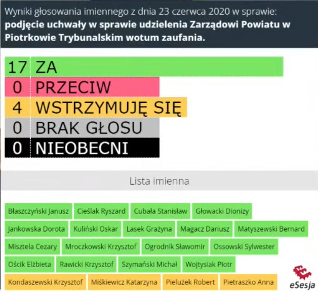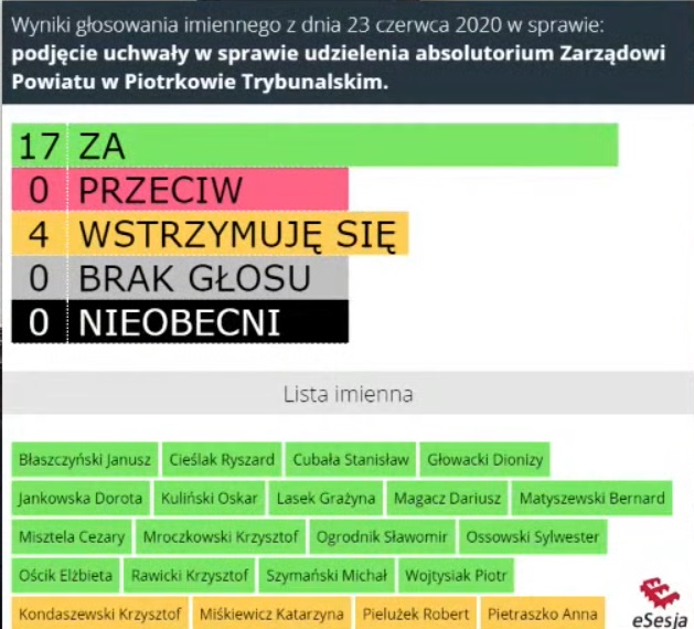 Rada Powiatu zapoznała się ze sprawozdaniem z realizacji budżetu powiatu piotrkowskiego, a także raportem o stanie Powiatu Piotrkowskiego za 2019 rok. Stosunkiem głosów 17 ZA przy 4 WSTRZYMUJĄCYCH udzieliła Staroście i Zarządowi Powiatu wotum zaufania i absolutorium.