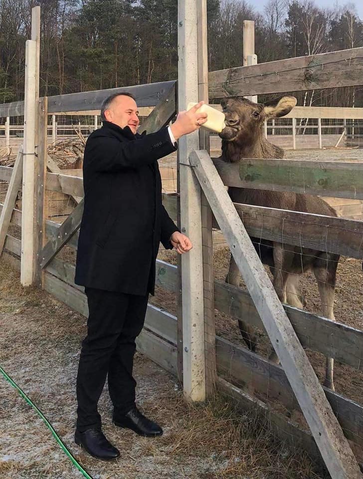 Wizyta starosty w osadzie zbiegła się z porą karmienia rehabilitowanych zwierząt, dlatego miał on okazję po raz pierwszy nakarmić młodego łosia.