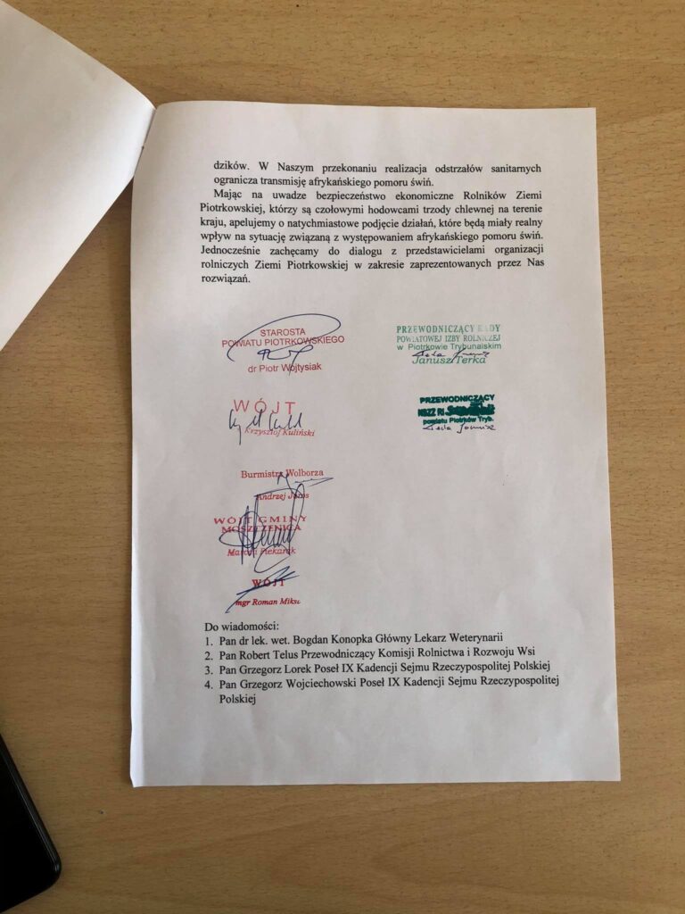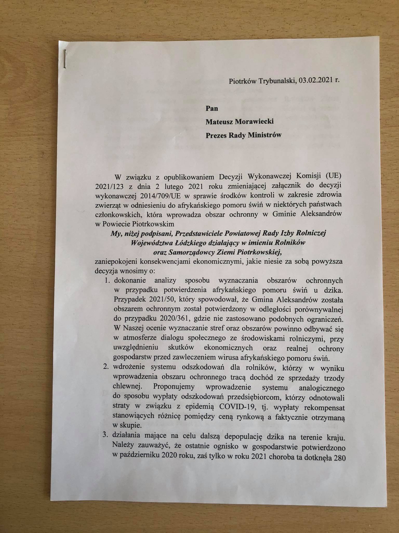 Rolnicy z powiatu poprosili starostę Piotra Wojtysiaka o pomoc w nakłonieniu rządu do skuteczniejszej walki z Afrykańskim Pomorem Świń. „Mając na uwadze bezpieczeństwo ekonomiczne Rolników Ziemi Piotrkowskiej, którzy są czołowymi hodowcami trzody chlewnej na terenie kraju, apelujemy o natychmiastowe podjęcie działań, które będą miały realny wpływ na sytuację związaną z występowaniem afrykańskiego pomoru świń. Jednocześnie zachęcamy do dialogu z przedstawicielami organizacji rolniczych Ziemi Piotrkowskiej w zakresie zaprezentowanych przez Nas rozwiązań.” czytamy między innymi w piśmie skierowanym do szefa rządu.