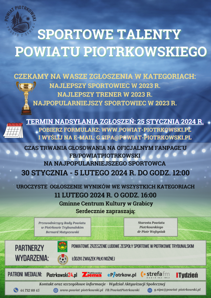 Kolejna edycja wydarzenia, organizowanego przez Starostwo Powiatowe w Piotrkowie Trybunalskim, ma na celu wyłonienie najlepszych i najpopularniejszych sportowców, a także najlepszych trenerów za działalność prowadzoną w 2023 r.