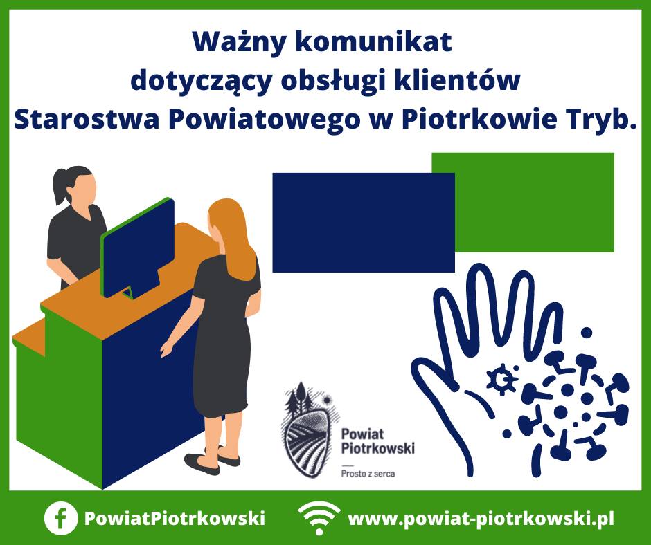 Starostwo Powiatowe w Piotrkowie Trybunalskim informuje, że zostaje ograniczony kontakt bezpośredni z klientem zewnętrznym poprzez: