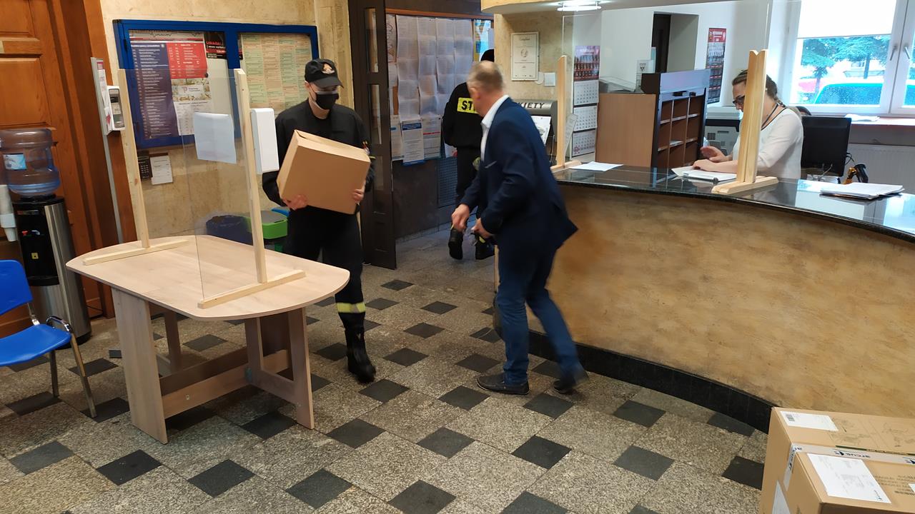 Piotrkowscy strażacy zajęli się dystrybucją płynów do dezynfekcji, przyłbic i żeli antybakteryjnych, wykorzystywanych podczas niedzielnych wyborów na prezydenta RP.