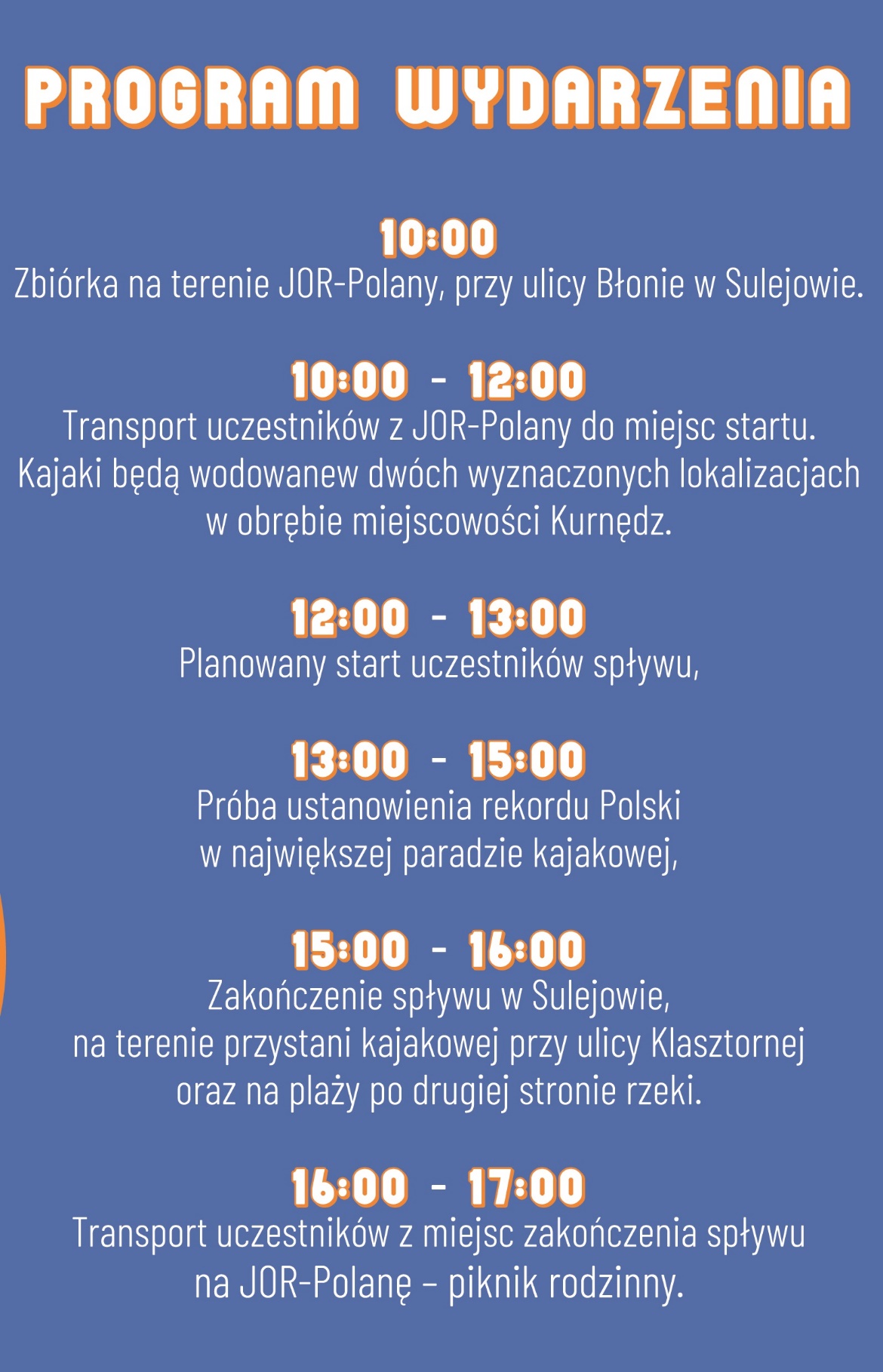 Przy współudziale lokalnych organizatorów spływów kajakowych spróbujemy ustanowić certyfikowany rekord Polski na odcinku Pilicy pomiędzy Kurnędzem a Sulejowem. Aby to zrobić, w jednym momencie na wodzie muszą się znajdować co najmniej 253 kajaki.