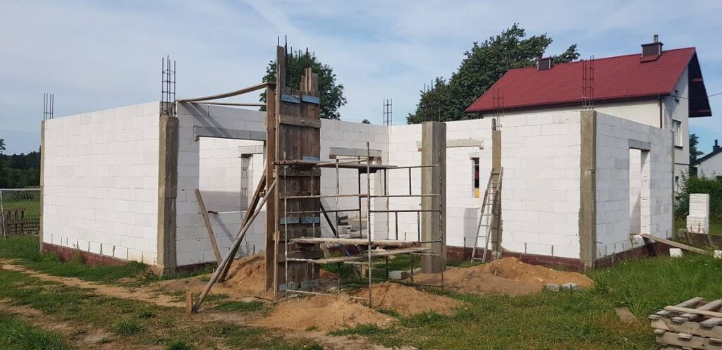 Trwają prace przy budowie budynku świetlicy wiejskiej w Grabostowie. Aktualnie zostały wykonane roboty przygotowawcze pod elementy konstrukcyjne stropu i ściany kolankowej. Wszystkie prace są wykonywane przez pracowników Referatu Gospodarki Komunalnej Urzędu Gminy.